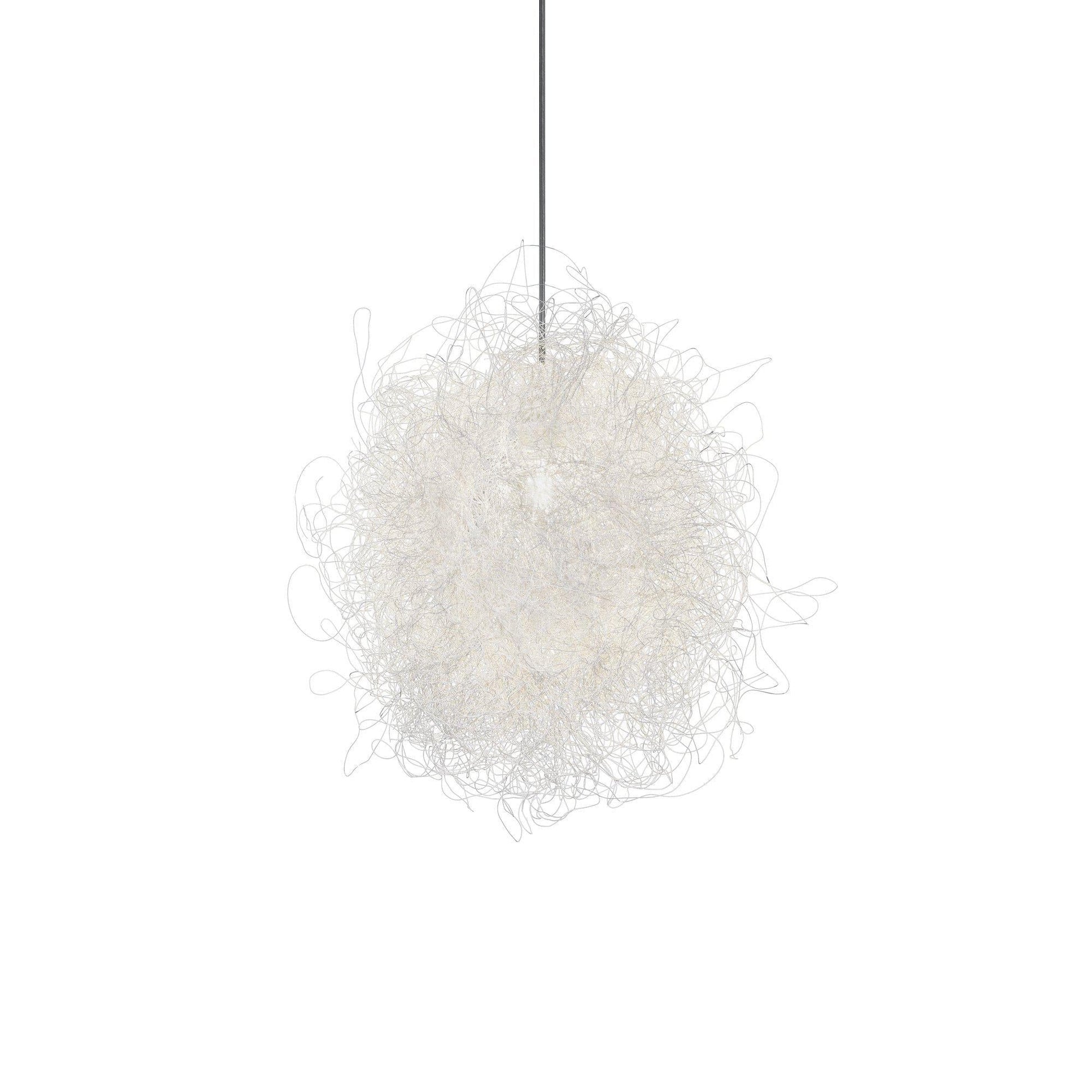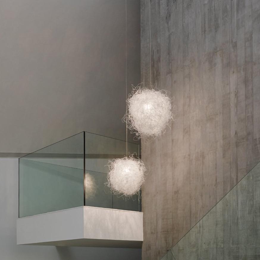 La suspension Pili de a-emotional light est composée d'un unique fil d'acier inoxydable peint qui s'entrelace, créant des volumes aléatoires et désordonnés, tissant une irrégularité harmonieuse et enveloppante pleine de charme et de mystère.