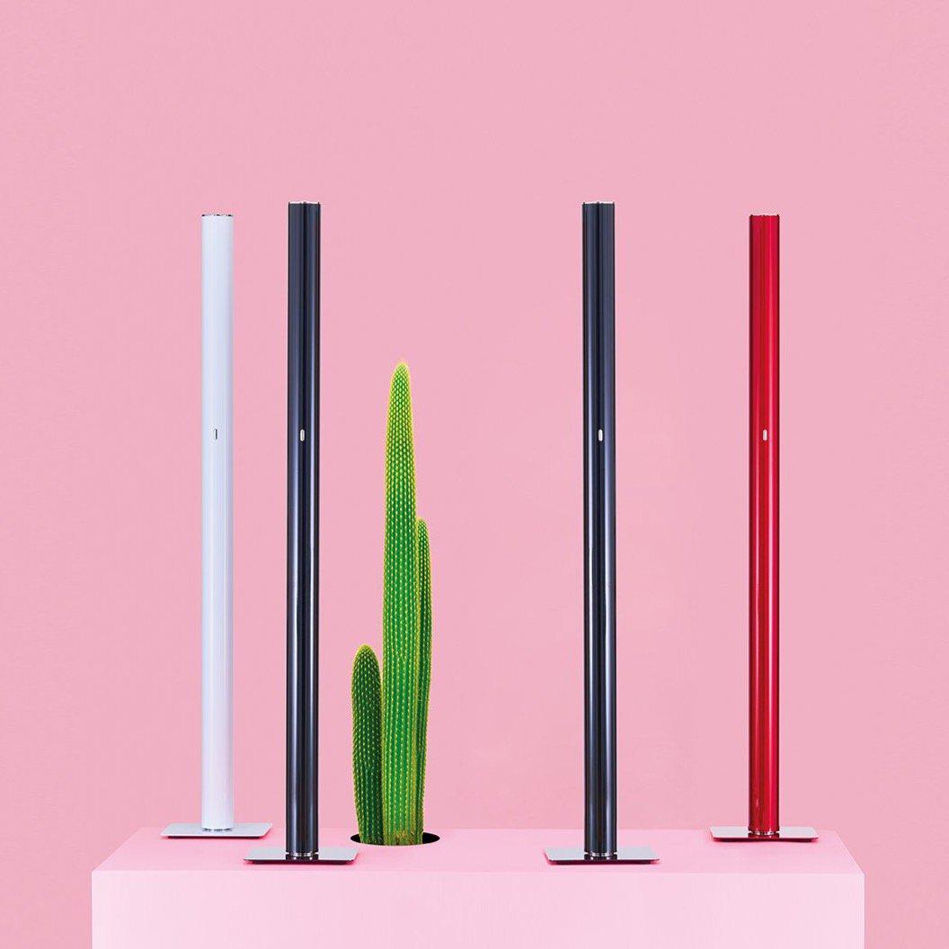 Le lampadaire Ilio d'Artemide , aux lignes épurées et minimalistes, attire le regard par sa couleur intense. Un cylindre en aluminium monomatériau supporte une LED de 39 W placée à son sommet, diffusant une lumière indirecte à haut rendement. Avec un flux lumineux de plus de 2 700 lumens et un rendement de 80 %, il assure un éclairage général optimal de la pièce.