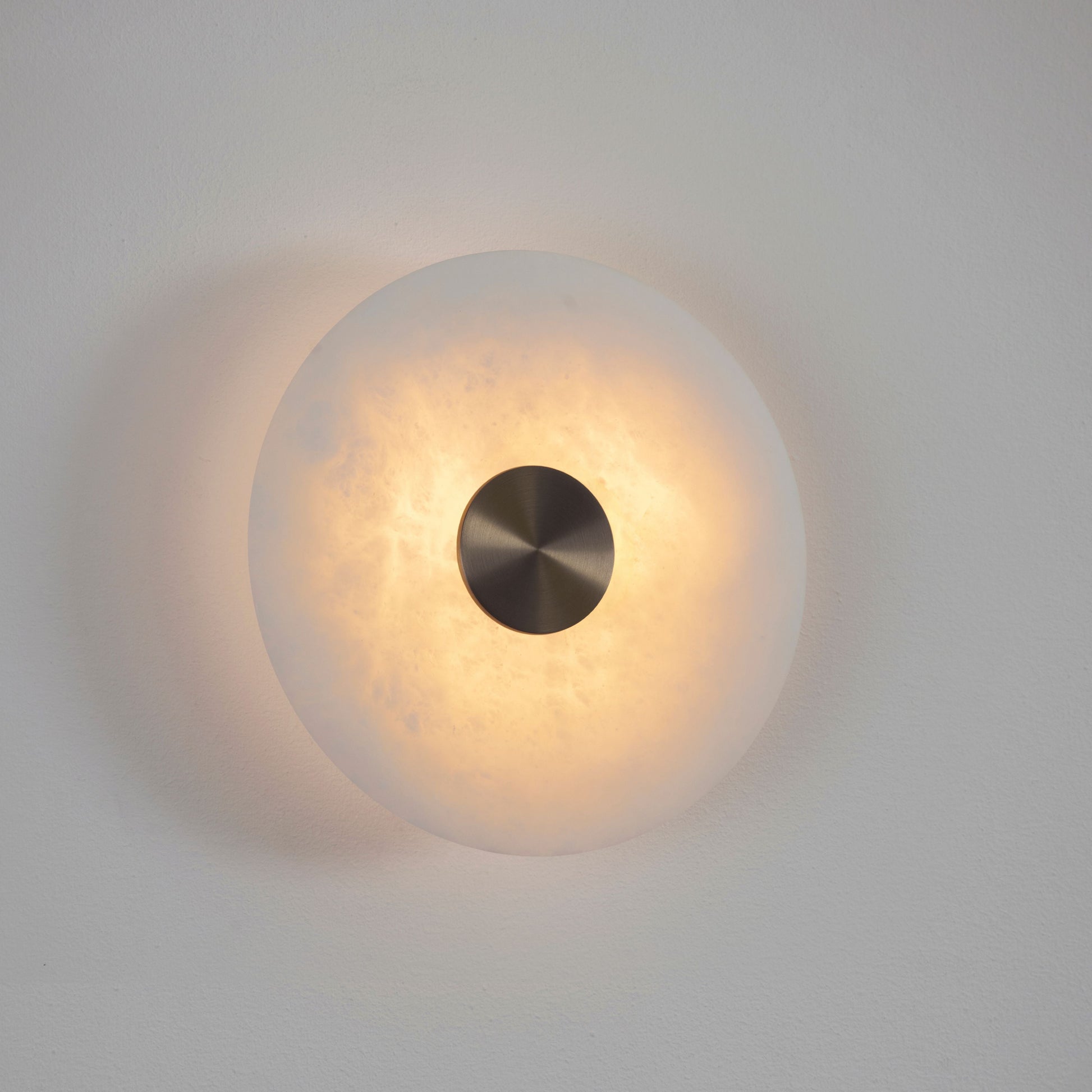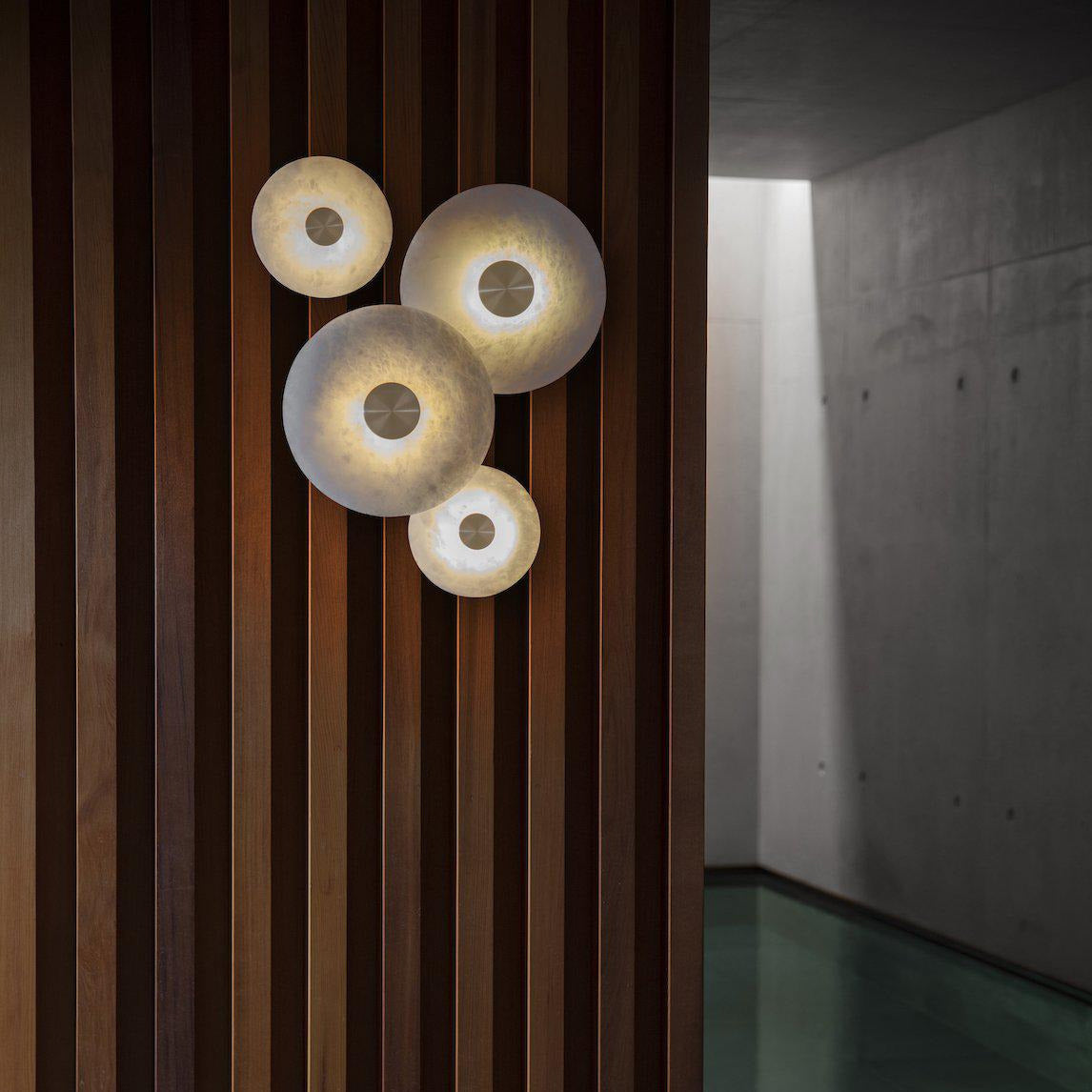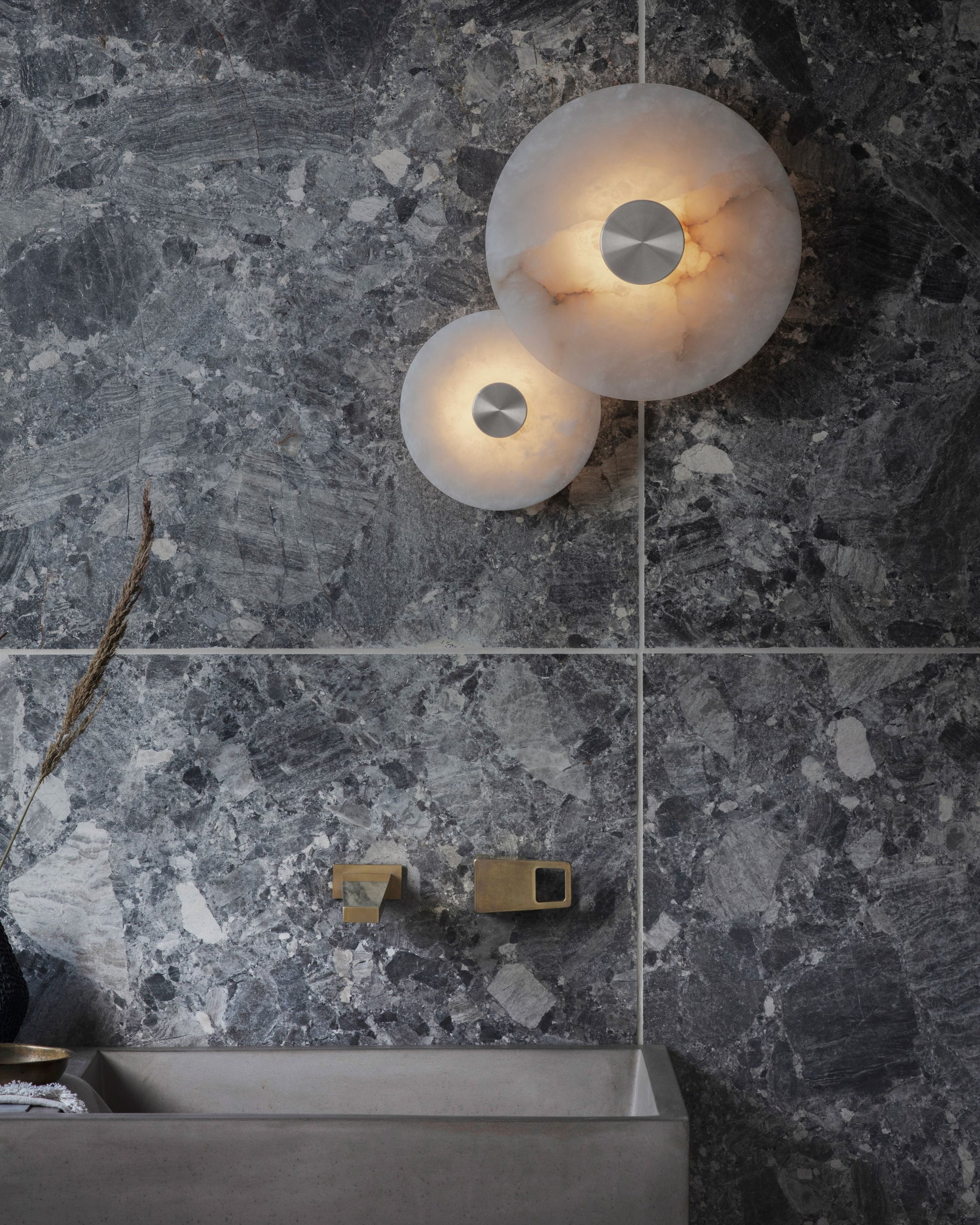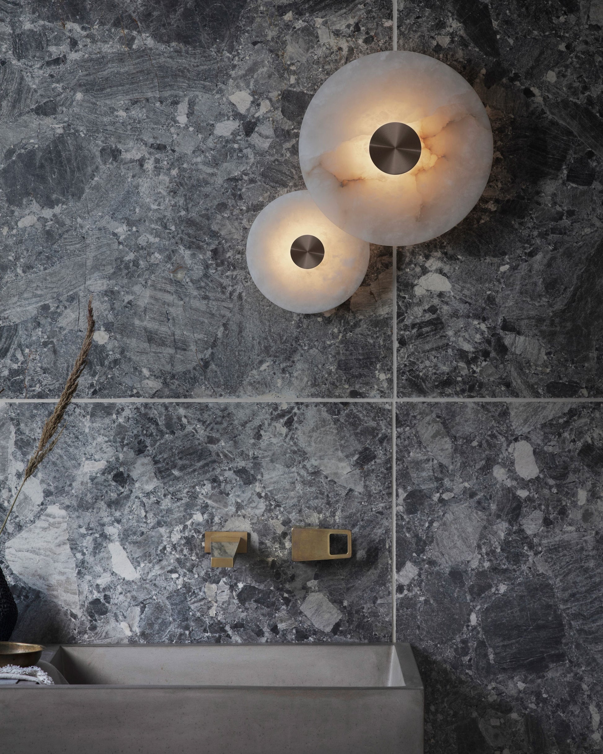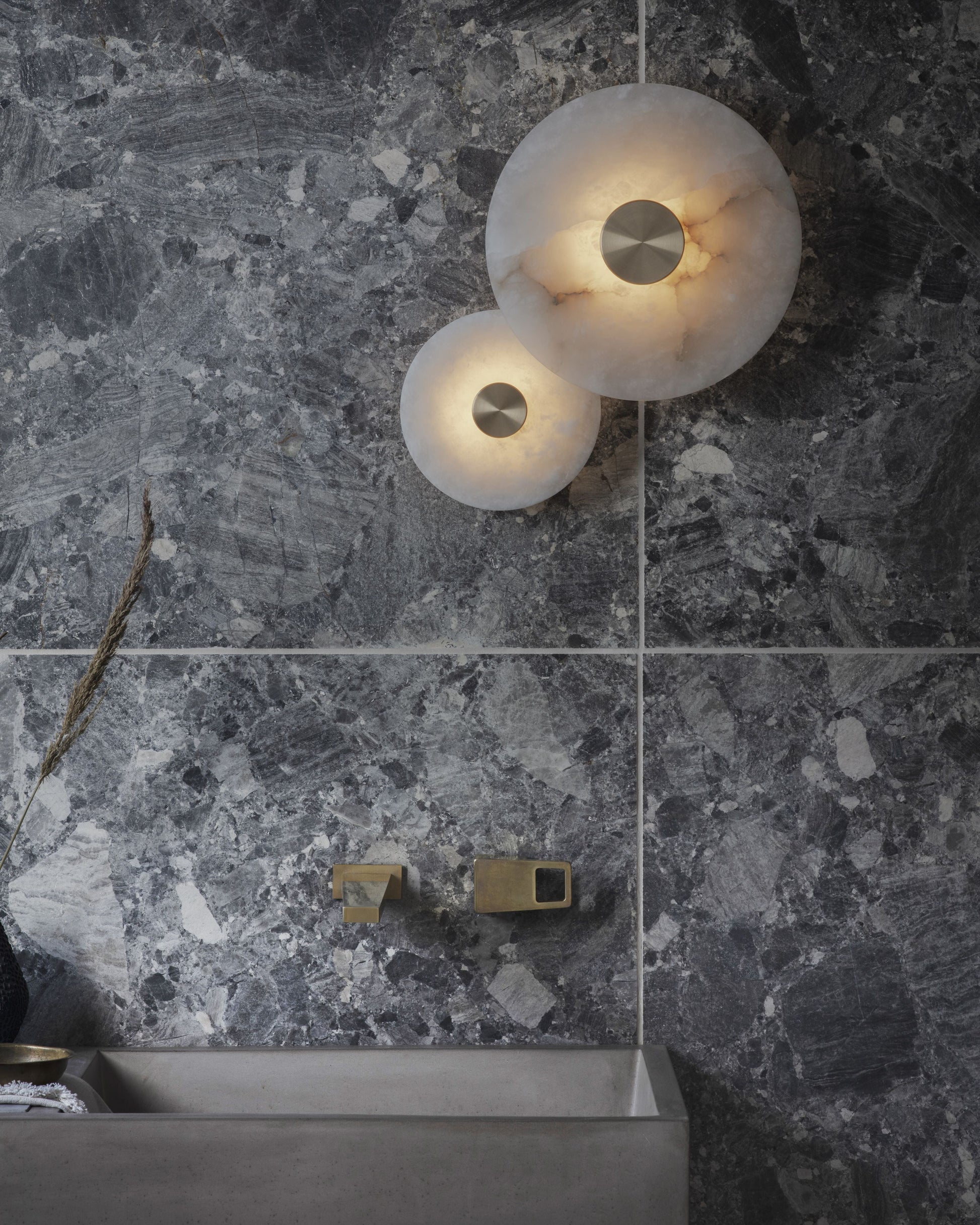 L'applique murale Bide de Bert Frank allie des matériaux bruts traditionnels comme le laiton et l'albâtre à des techniques d'ingénierie modernes, créant ainsi un mariage harmonieux d'élégance et de robustesse. L'albâtre étant une pierre naturelle, chaque pièce présente des veinures et des détails uniques. Indice de protection IP65 : convient aux pièces humides.