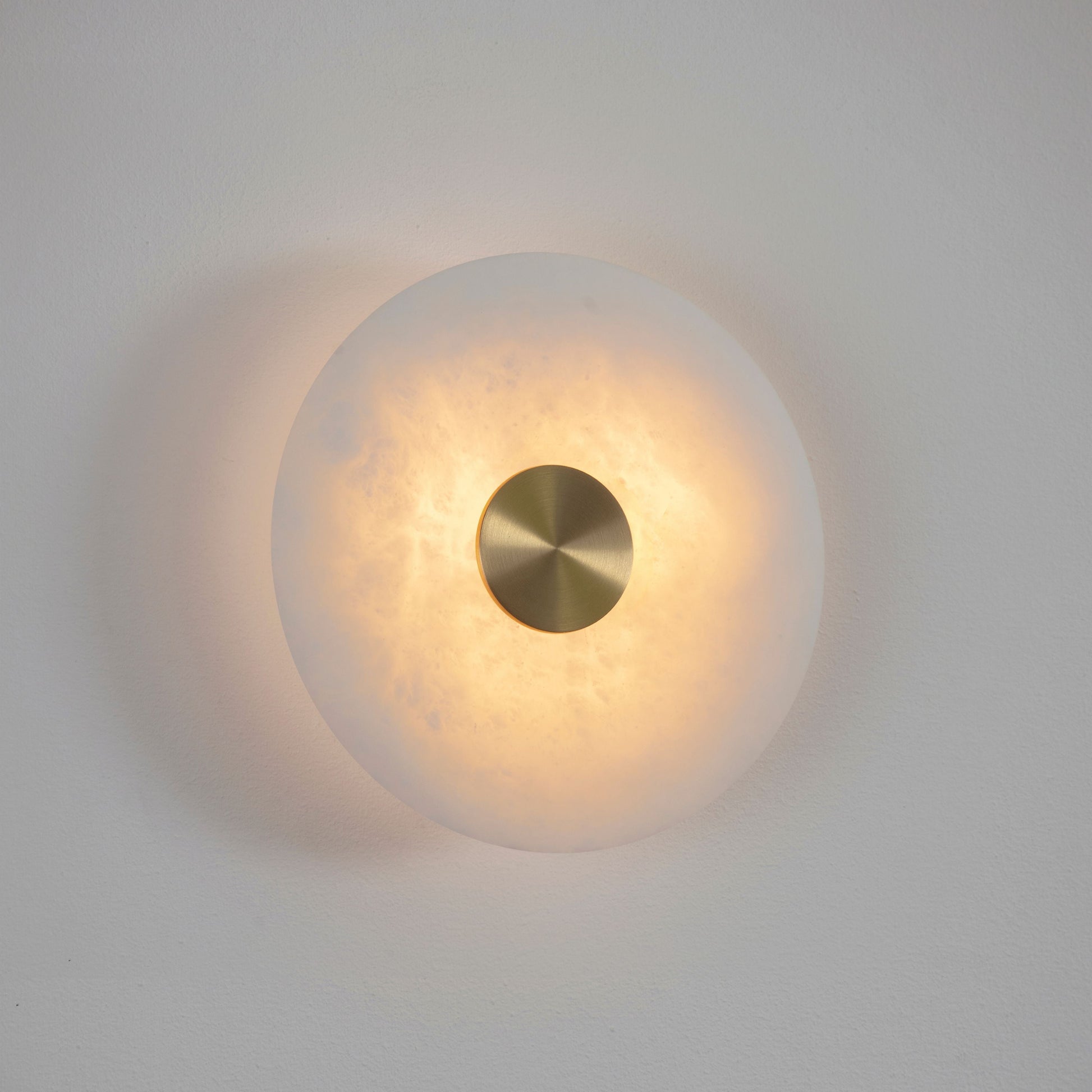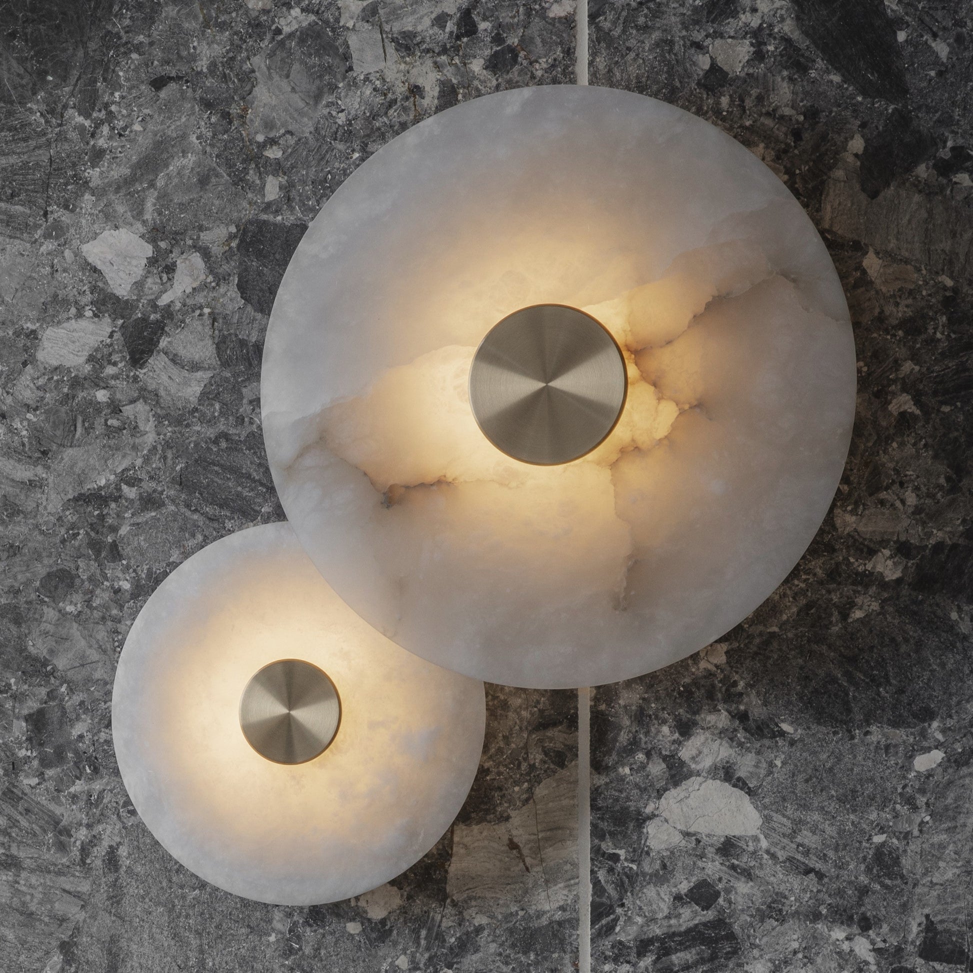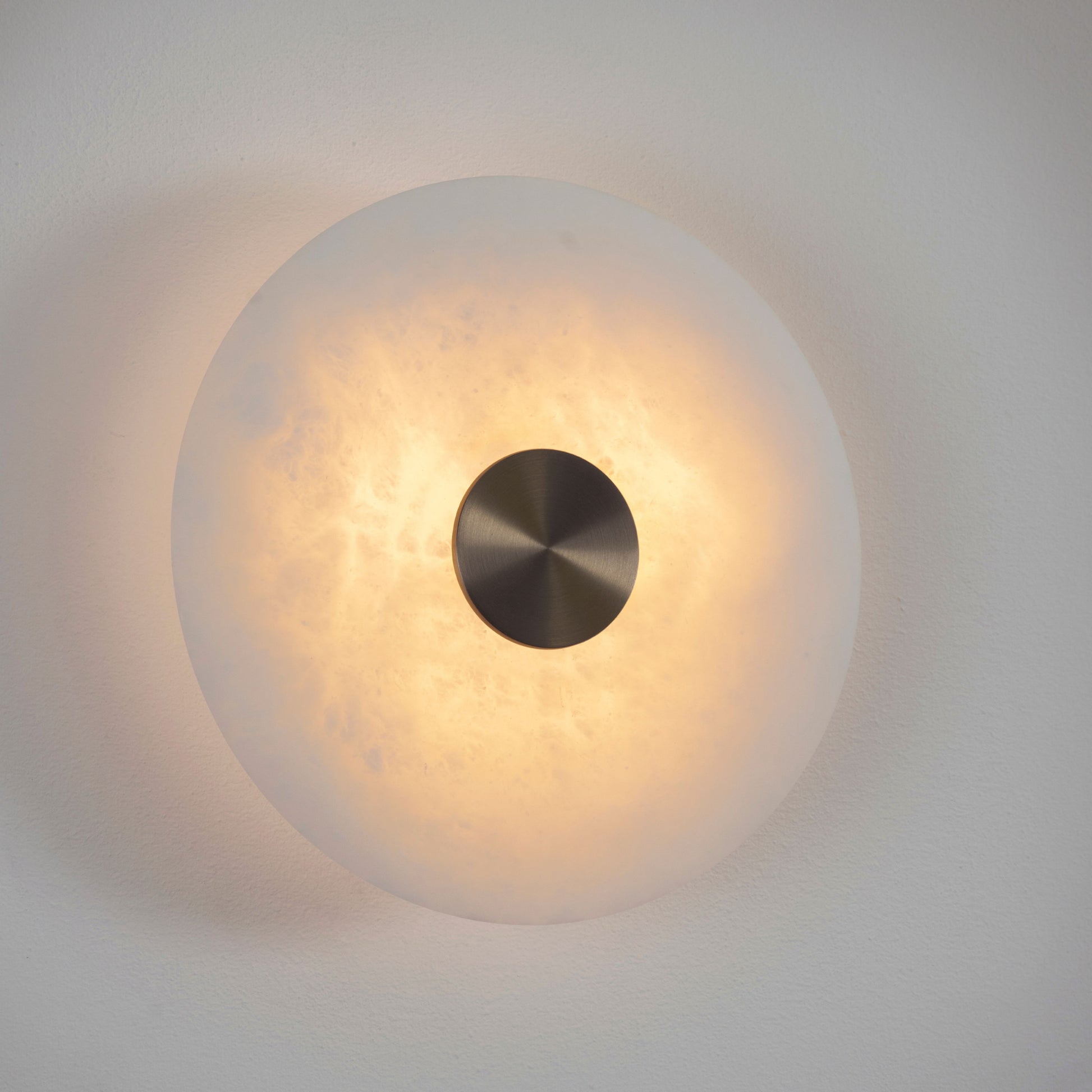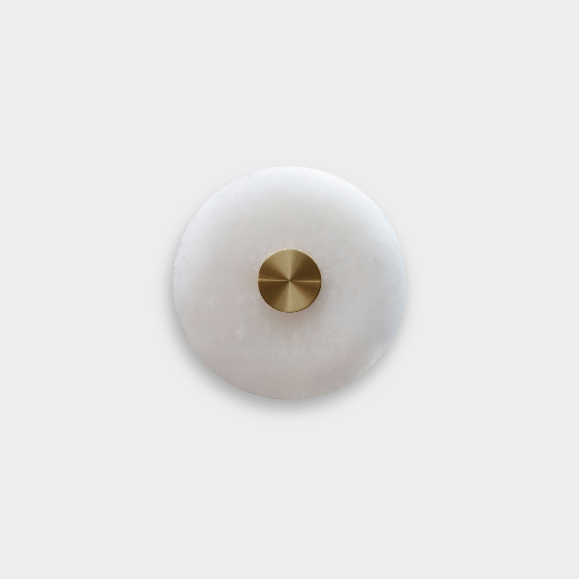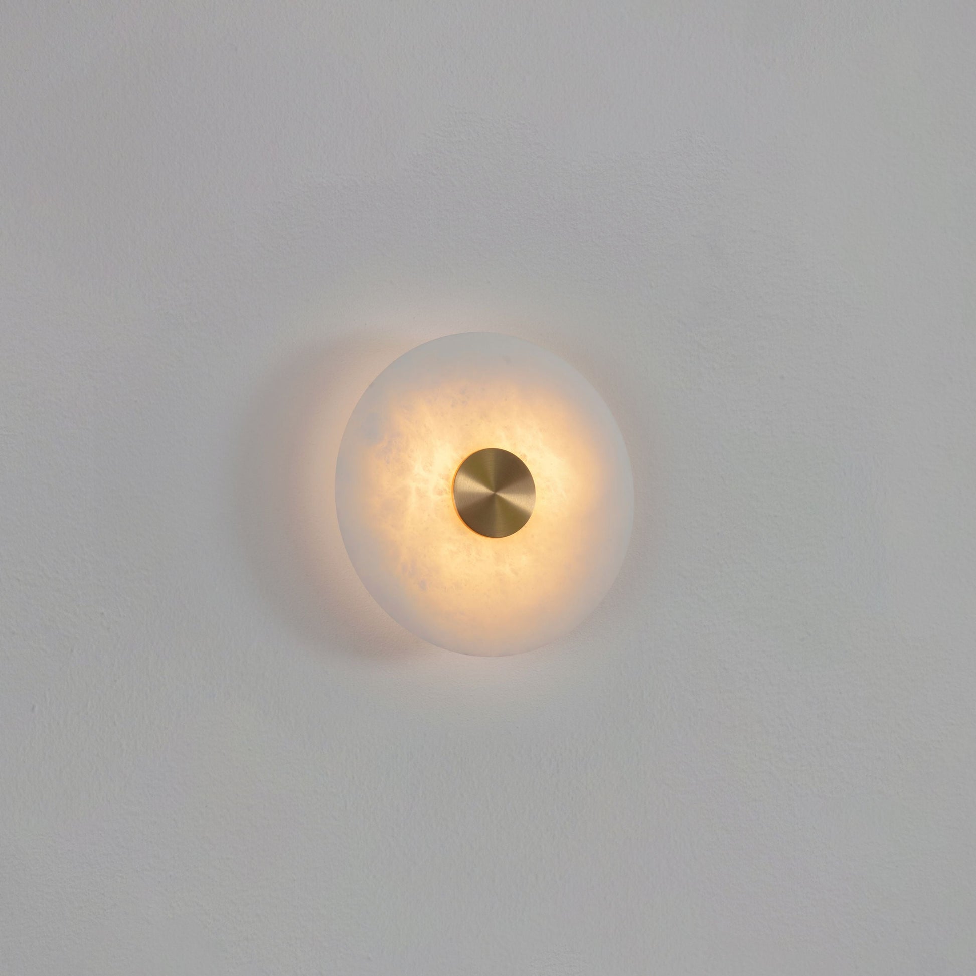 L'applique murale Bide de Bert Frank allie des matériaux bruts traditionnels comme le laiton et l'albâtre à des techniques d'ingénierie modernes, créant ainsi un mariage harmonieux d'élégance et de robustesse. L'albâtre étant une pierre naturelle, chaque pièce présente des veinures et des détails uniques. Indice de protection IP65 : convient aux pièces humides.