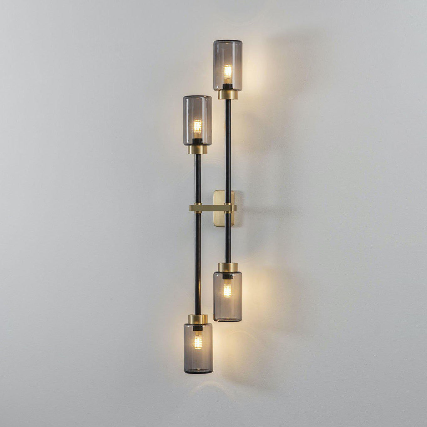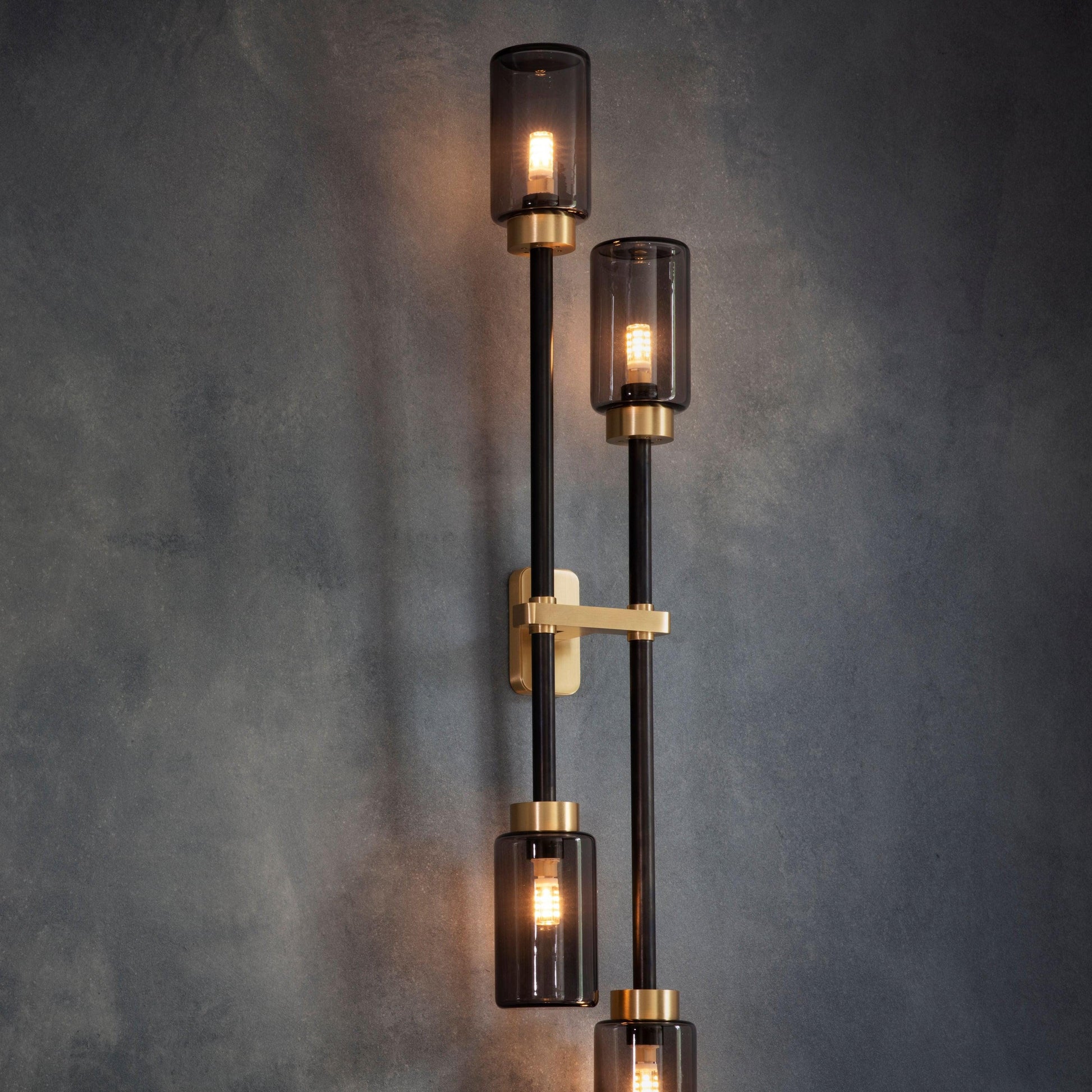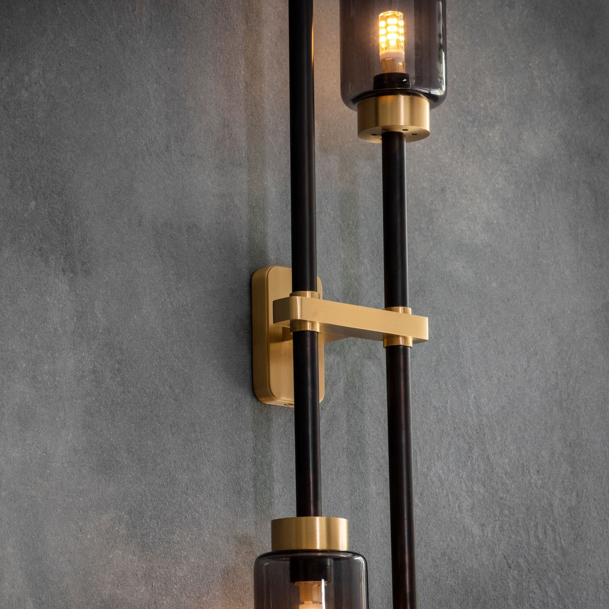 L'applique murale Farol Double de Bert Frank se compose de deux bras élancés supportant quatre abat-jour cylindriques en verre à des hauteurs asymétriques. Finition laiton et bronze. Disponible avec des abat-jour en verre opale ou fumé.