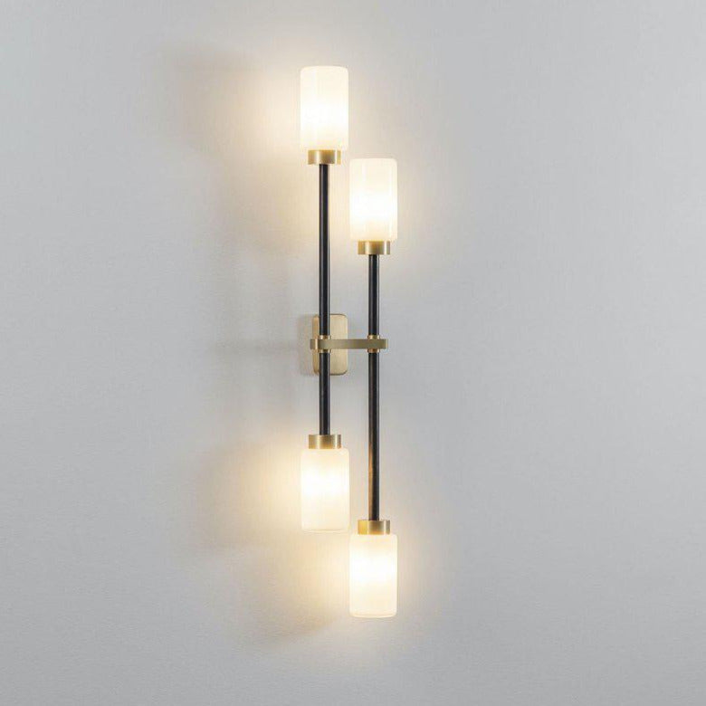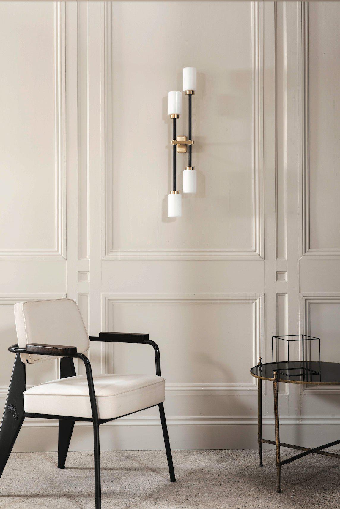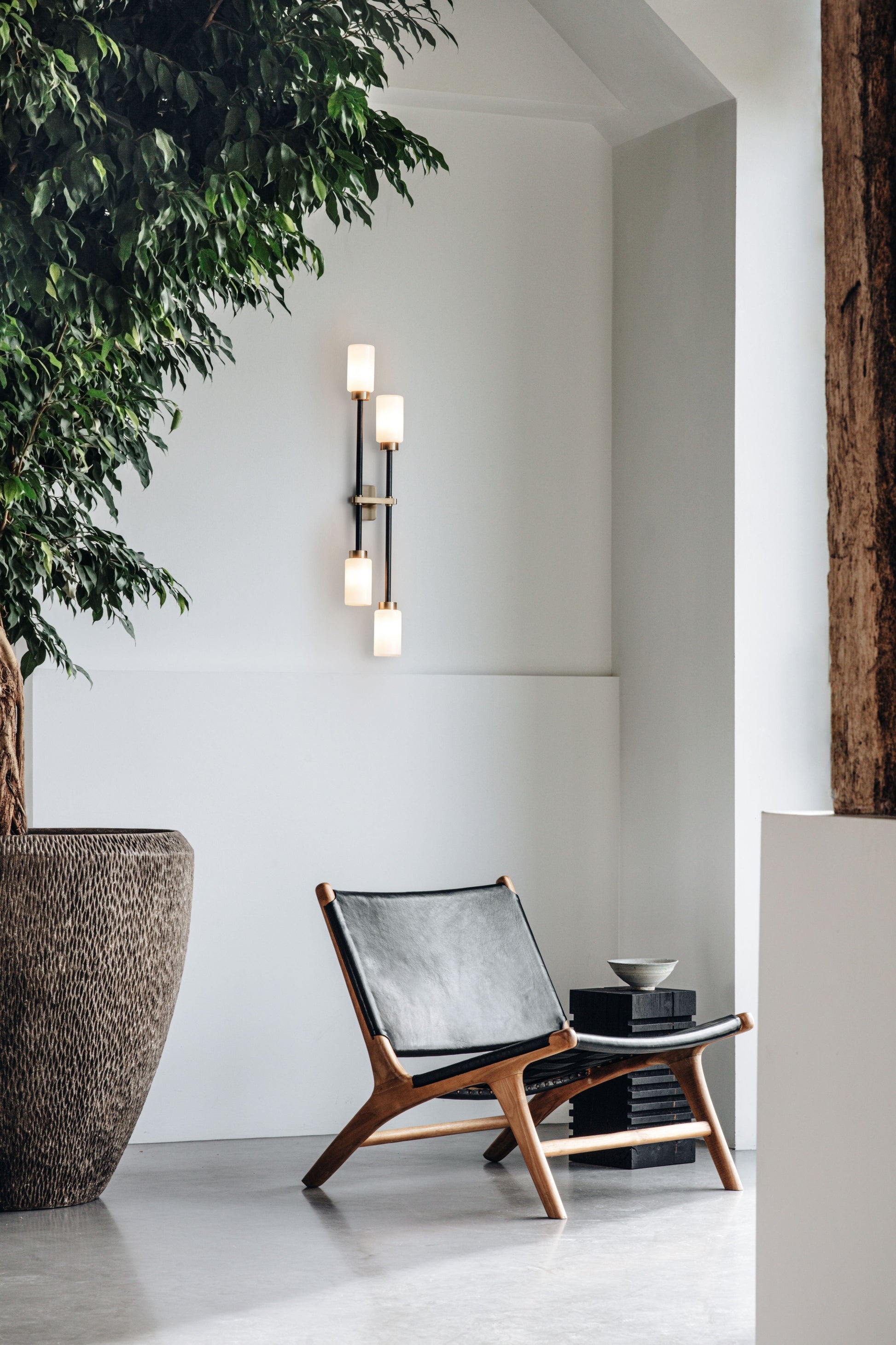 L'applique murale Farol Double de Bert Frank se compose de deux bras élancés supportant quatre abat-jour cylindriques en verre à des hauteurs asymétriques. Finition laiton et bronze. Disponible avec des abat-jour en verre opale ou fumé.
