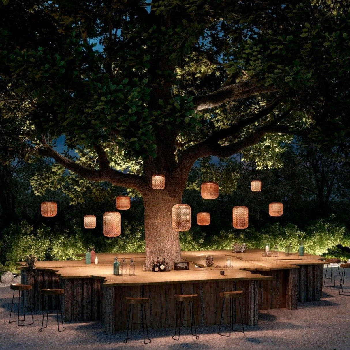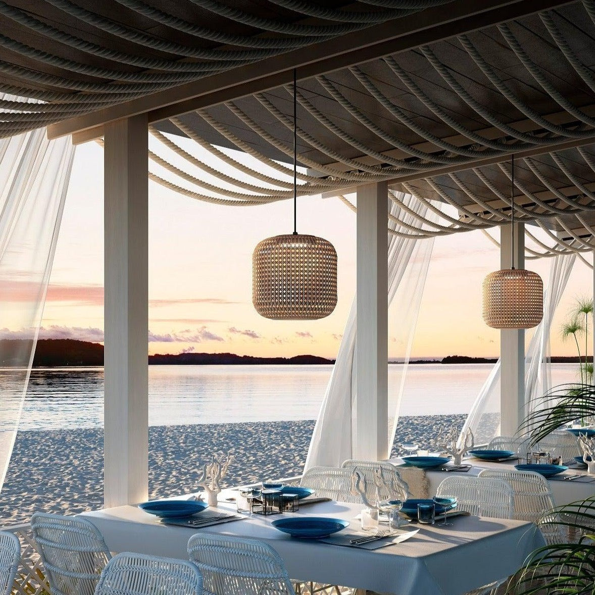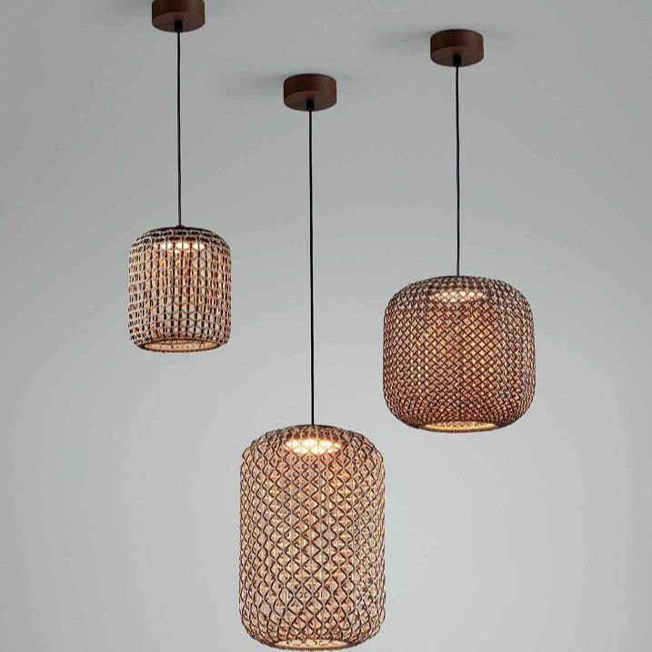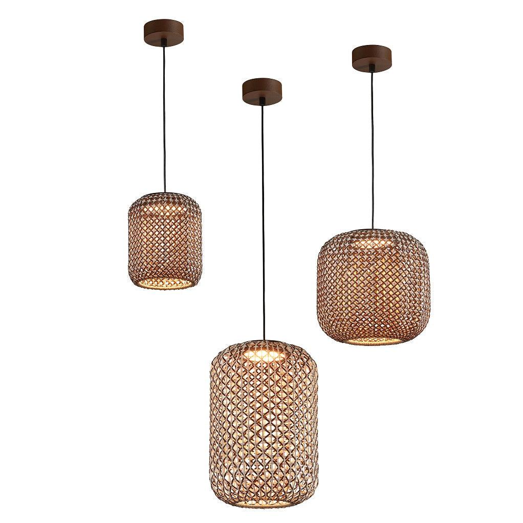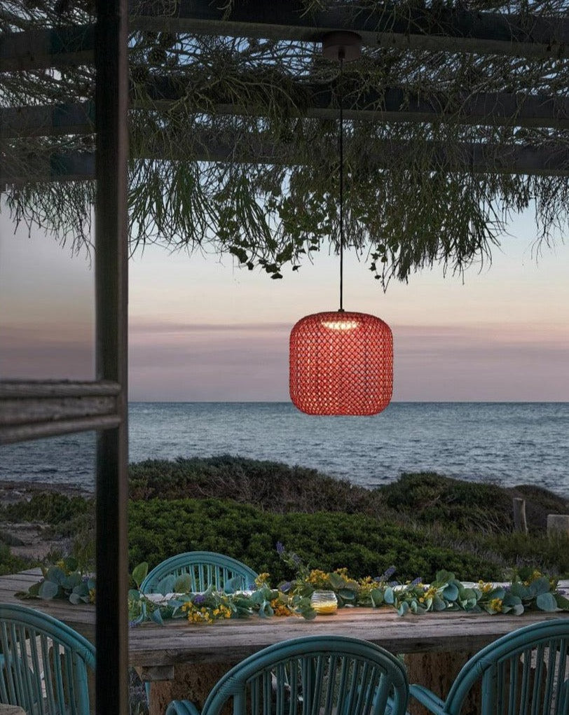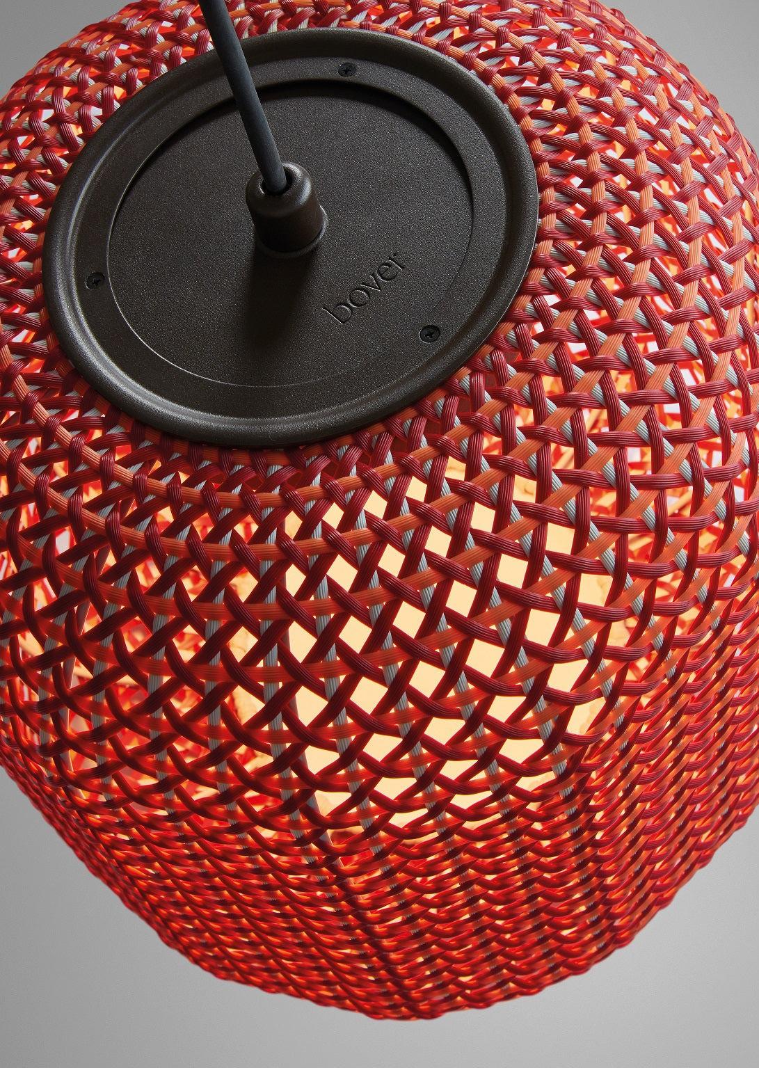 La suspension d'extérieur Nans de Bover est disponible en quatre tailles : petite, moyenne, grande et très grande. Son abat-jour en fibres de polyéthylène synthétiques tissées, recyclables et non toxiques, est proposé en brun graphite, rouge, marron ou beige. Avec Nans, Bover a souhaité mettre en valeur le savoir-faire artisanal de la fabrication de l'abat-jour et a exploré une nouvelle technique de tissage en combinant différentes couleurs et formats pour créer un véritable style méditerranéen.