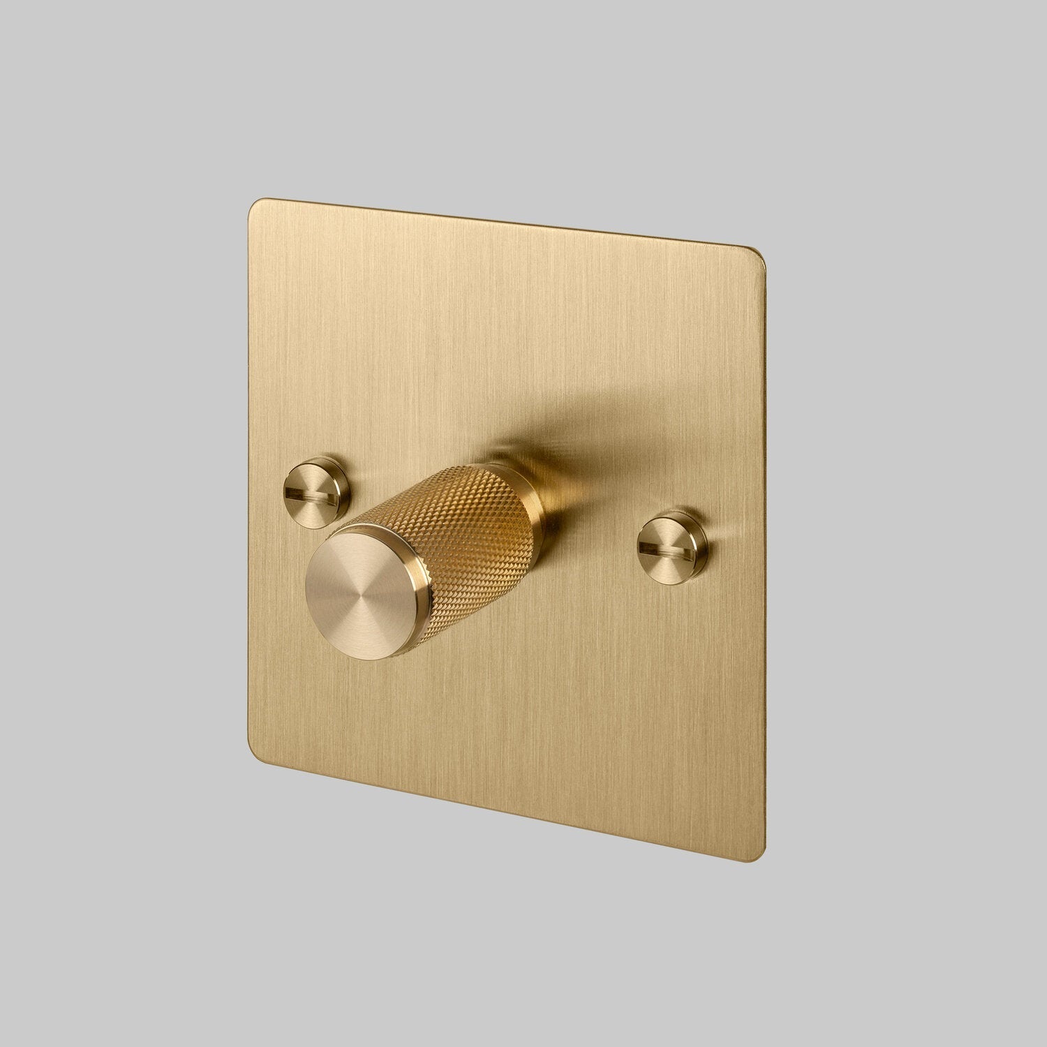 Le variateur 1G de Buster + Punch est en laiton. Le bouton du variateur présente un moletage croisé à facettes et la plaque plate est fixée par des vis à tête ronde en laiton massif.