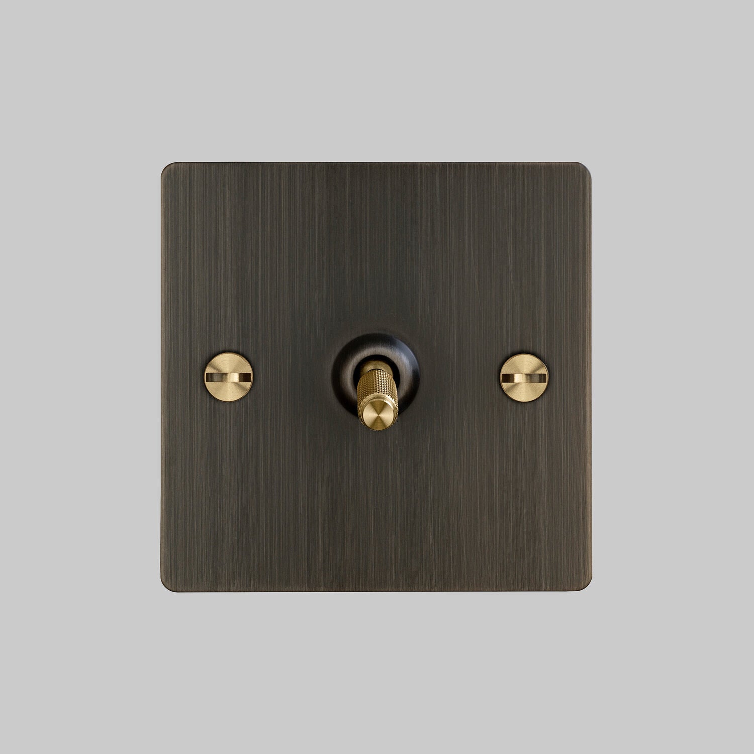 Interrupteur à bascule intermédiaire 1G de Buster + Punch, finition bronze fumé. Le bras de l'interrupteur peut être réalisé en bronze fumé massif, en acier ou en laiton et présente un moletage croisé à facettes diamantées.