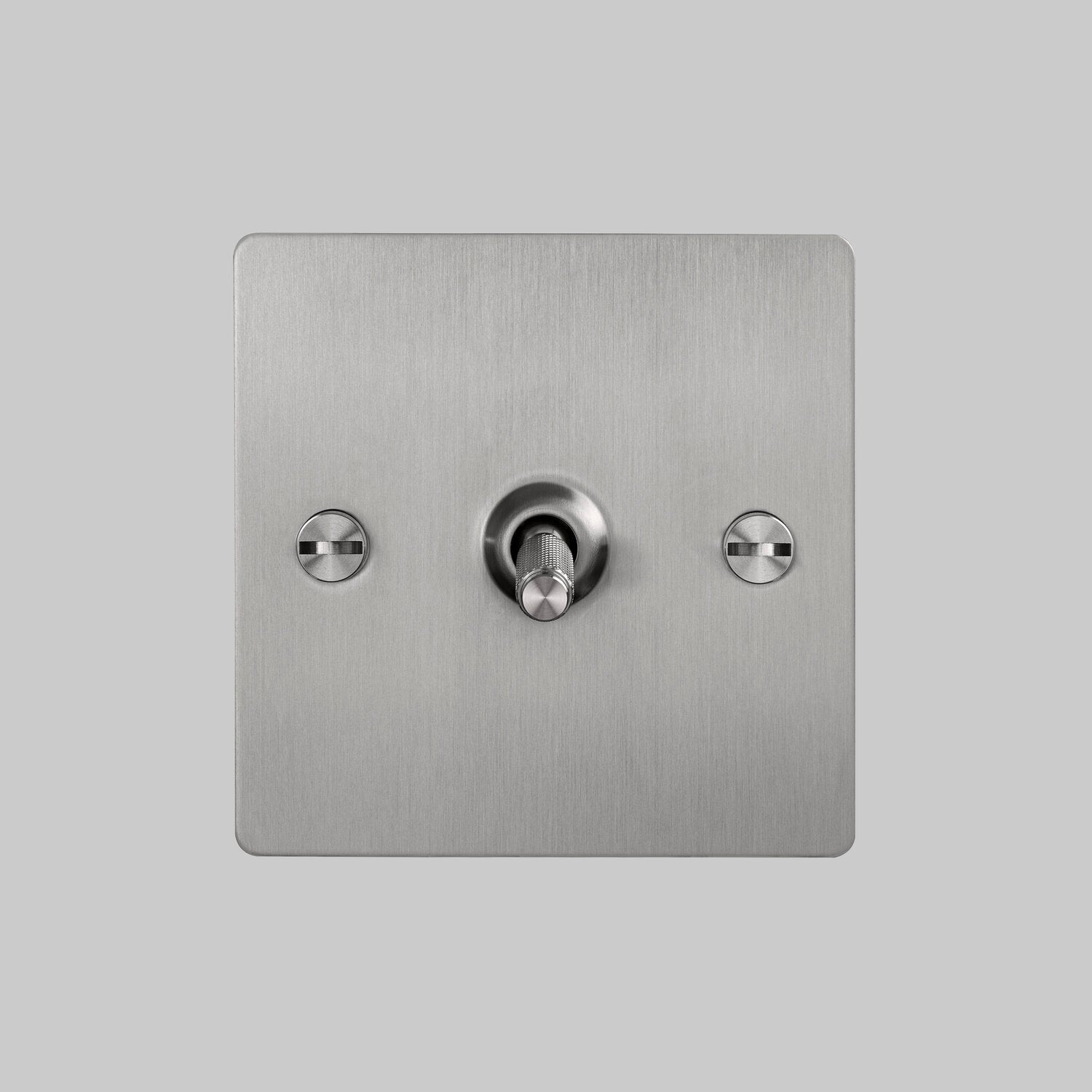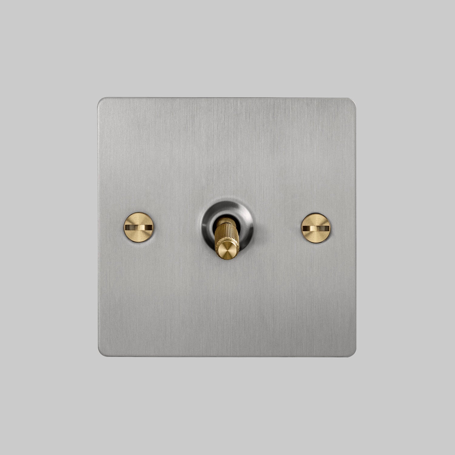 Interrupteur à bascule intermédiaire 1G de Buster + Punch, finition acier. Le bras de bascule peut être réalisé en acier massif ou en laiton et présente un moletage croisé à facettes diamantées.