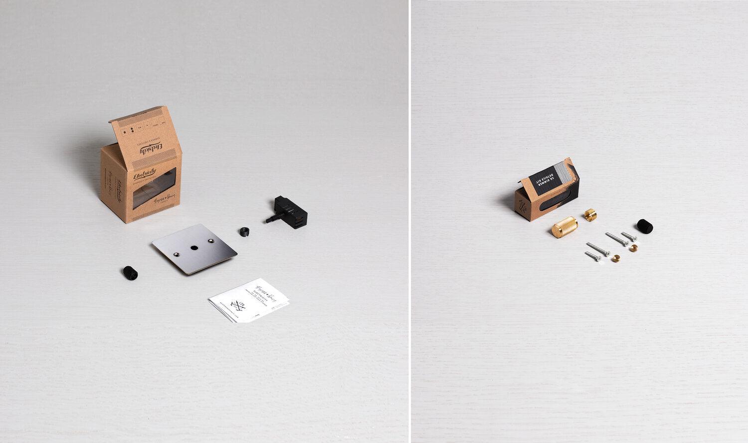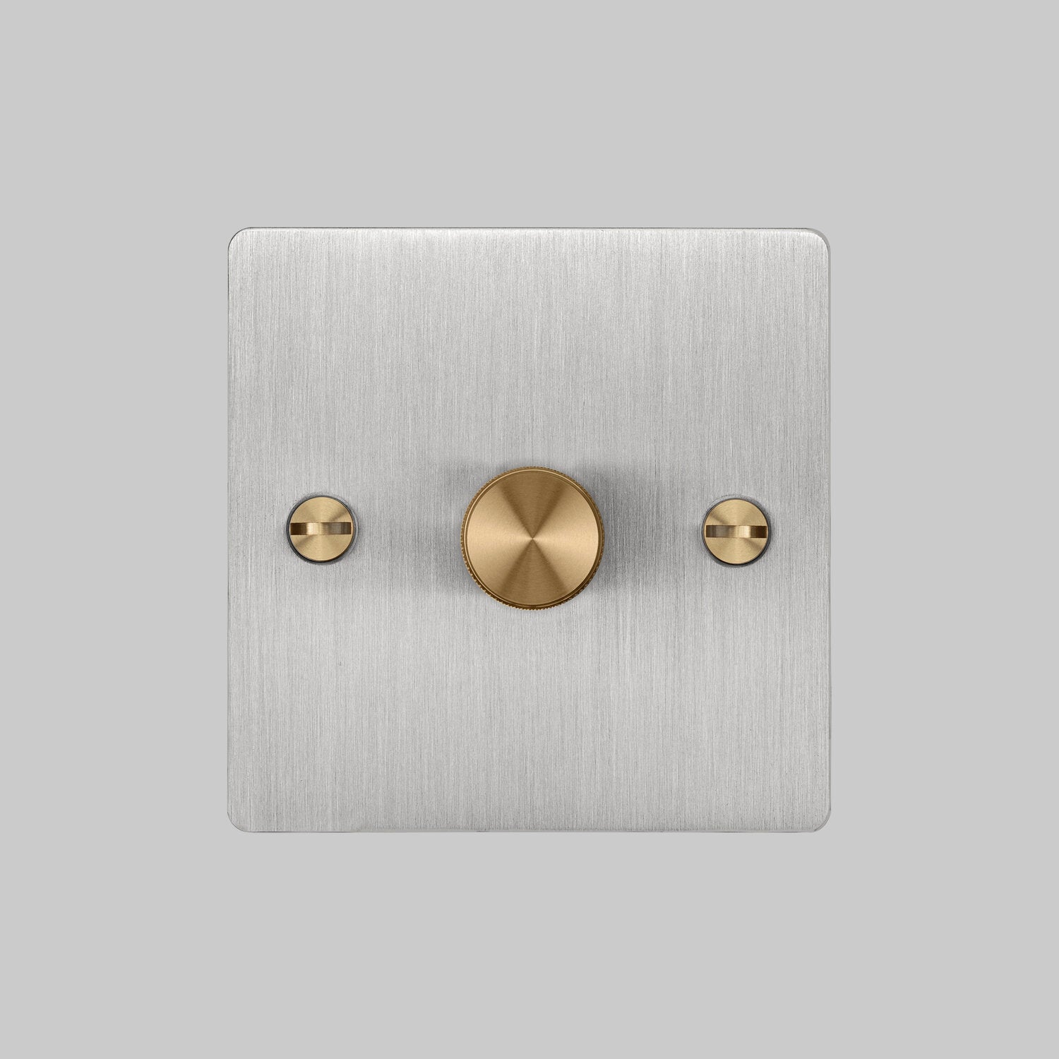 Le variateur 1G de Buster + Punch est en acier et propose différents kits de finition en métal massif. Ces kits incluent un bouton de variateur et des vis à tête ronde, disponibles en acier ou en laiton. Le bouton de variateur présente un moletage croisé à facettes et la plaque plate est fixée par des vis à tête ronde en métal massif.