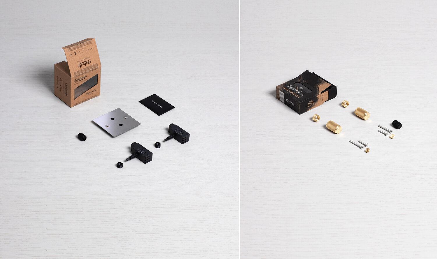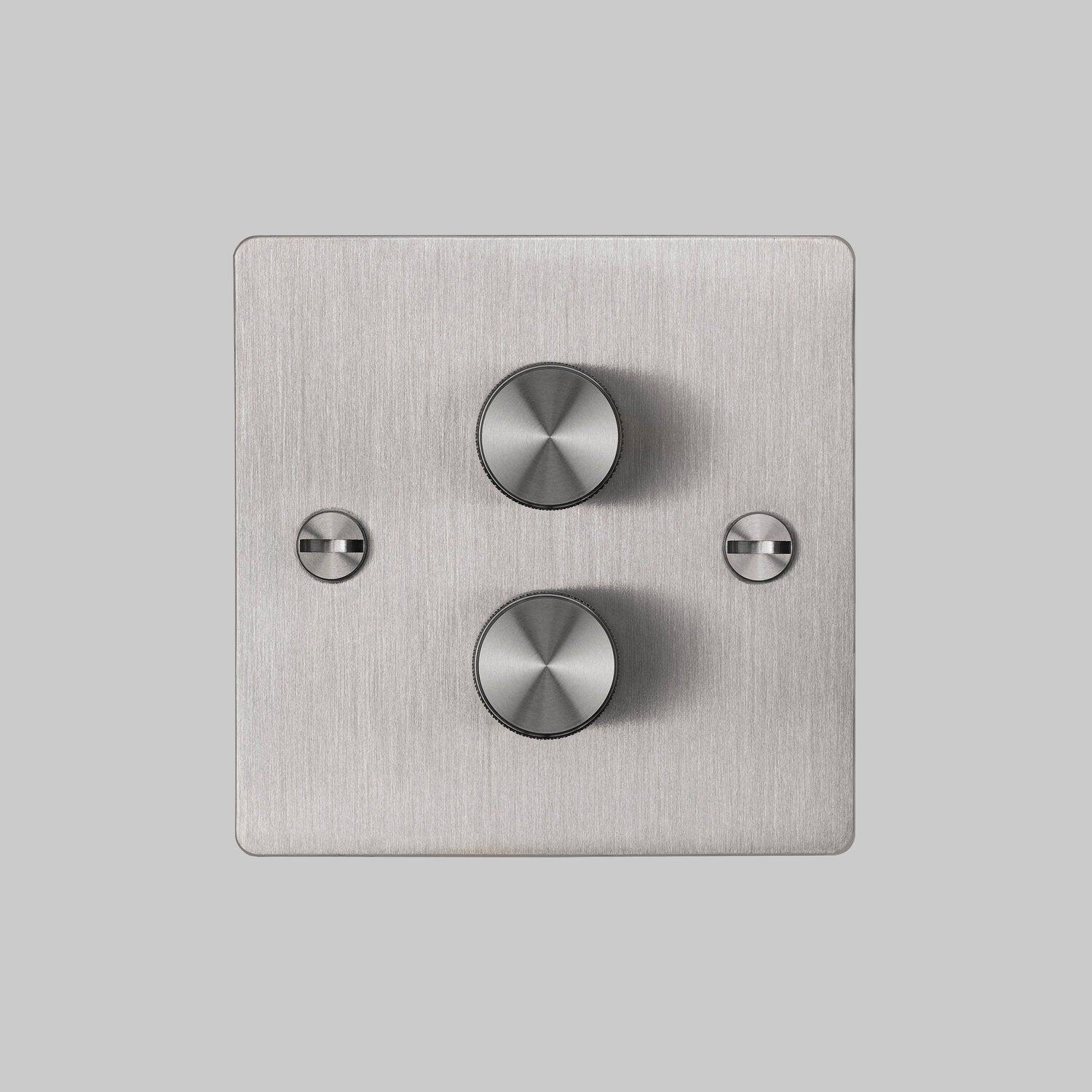 L'interrupteur variateur 2G de Buster + Punch est en acier et propose différents kits de finition en métal massif. Ces kits incluent un bouton de variateur et des vis à tête ronde, disponibles en acier ou en laiton. Le bouton de variateur présente un moletage croisé à facettes et la plaque plate est fixée par des vis à tête ronde en métal massif.