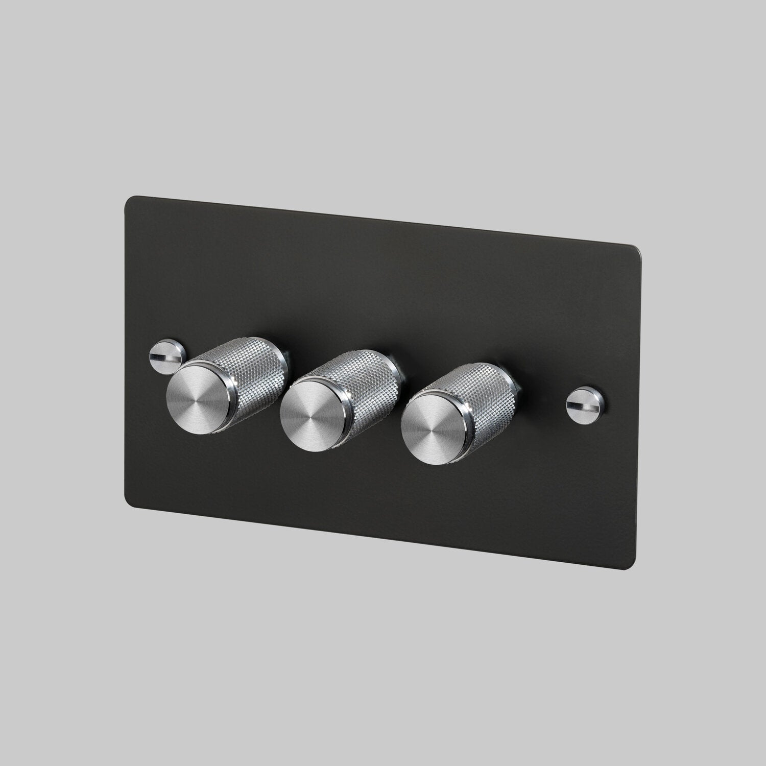 L'interrupteur variateur 3G de Buster + Punch est en métal massif avec une finition peinture PU résistante et stabilisée aux UV. Il est proposé avec différents kits d'accessoires en métal massif, incluant un bouton de variateur et des vis à tête fraisée, disponibles en acier, laiton ou noir. Le bouton de variateur présente un moletage croisé à facettes et la plaque plate est fixée par des vis à tête fraisée en métal massif.