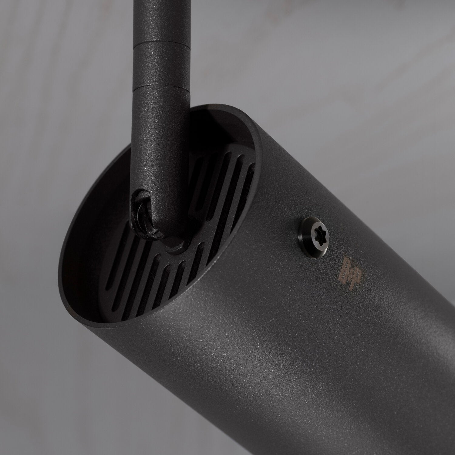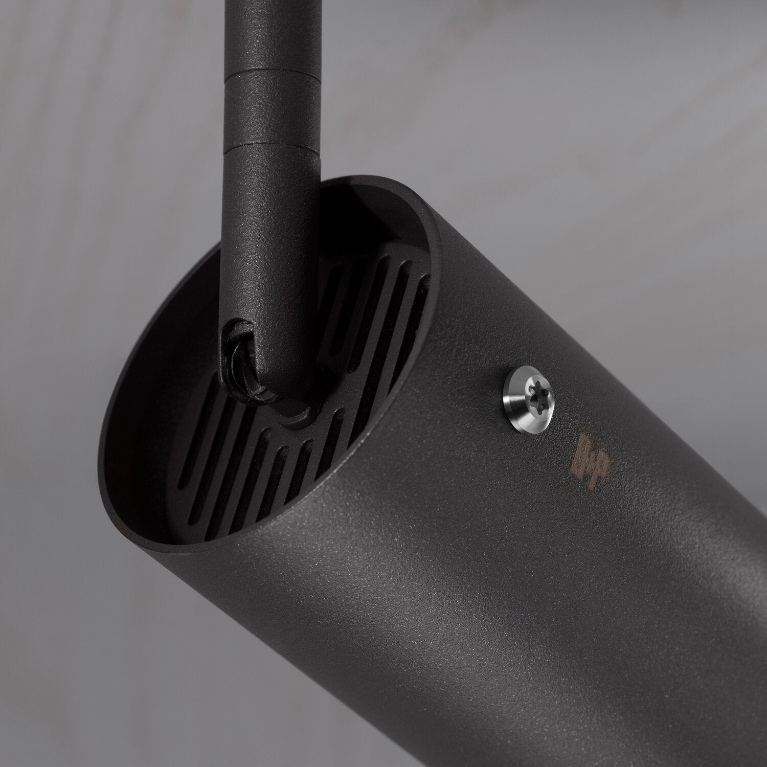 Le spot Exhaust de Buster + Punch est un luminaire orientable en métal revêtu de peinture en poudre graphite, avec des détails en métal massif. Il est doté d'un déflecteur à moletage linéaire et de vis Torx usinées, tous deux en métal massif assorti. Le déflecteur capte la lumière et crée une douce lueur métallique, tandis qu'un filtre en nid d'abeille diffuse un faisceau directionnel précis et non éblouissant. Entièrement orientable, ce spot est fourni avec une rosace de plafond encastrée et est compatible avec une ampoule GU10. Une rallonge de rosace, également en métal graphite assorti, est incluse pour une installation sur câbles apparents.