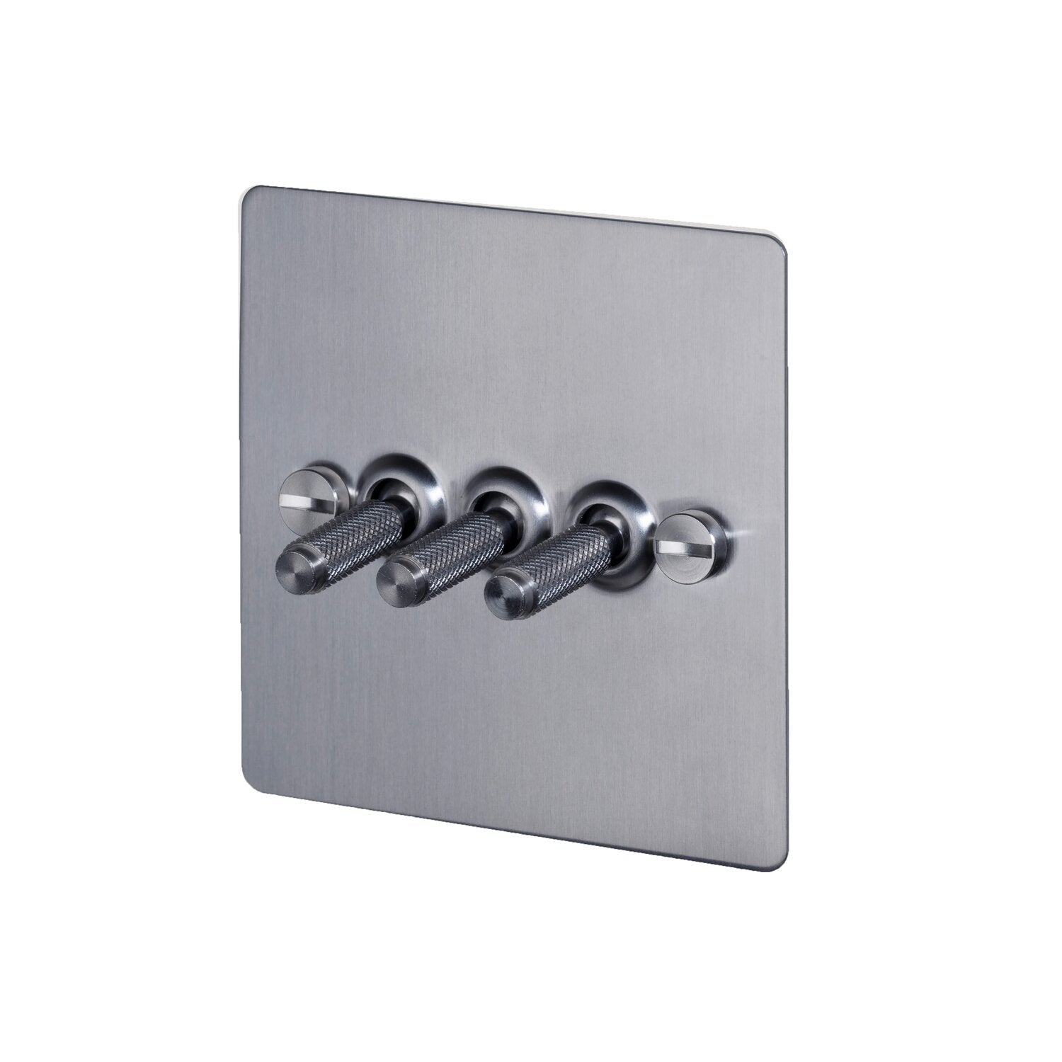 L'interrupteur à bascule 3G de Buster + Punch est en acier. Son bras peut être réalisé en acier massif ou en laiton et présente un moletage croisé à facettes diamantées.