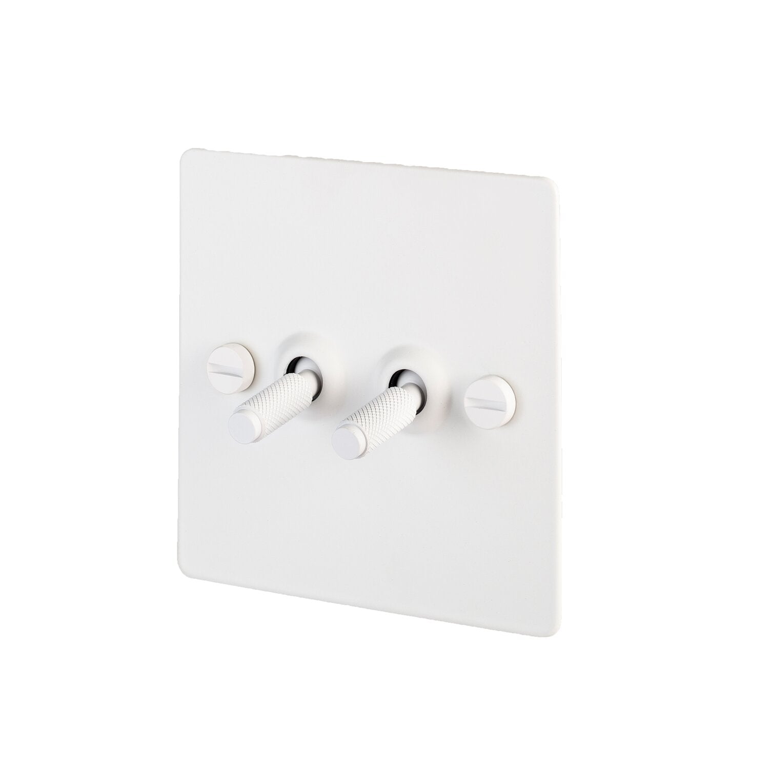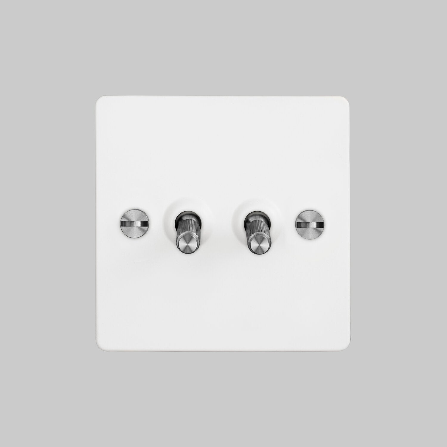 L'interrupteur à bascule 2G de Buster + Punch est en métal massif avec une finition peinture PU résistante et stabilisée aux UV. Il est proposé avec différents kits de détails en métal massif, comprenant un levier et des vis à tête fraisée, disponibles en acier, laiton ou blanc.