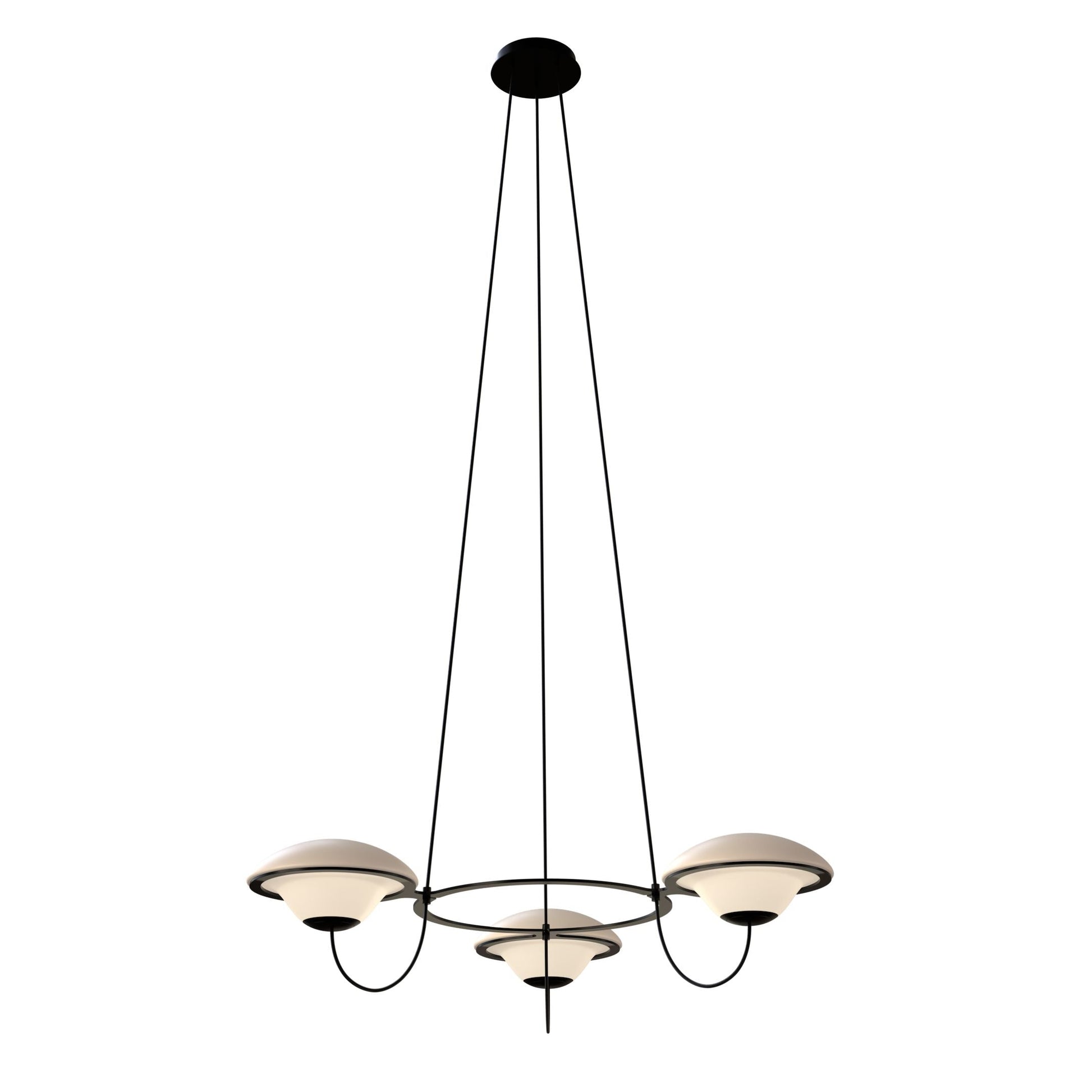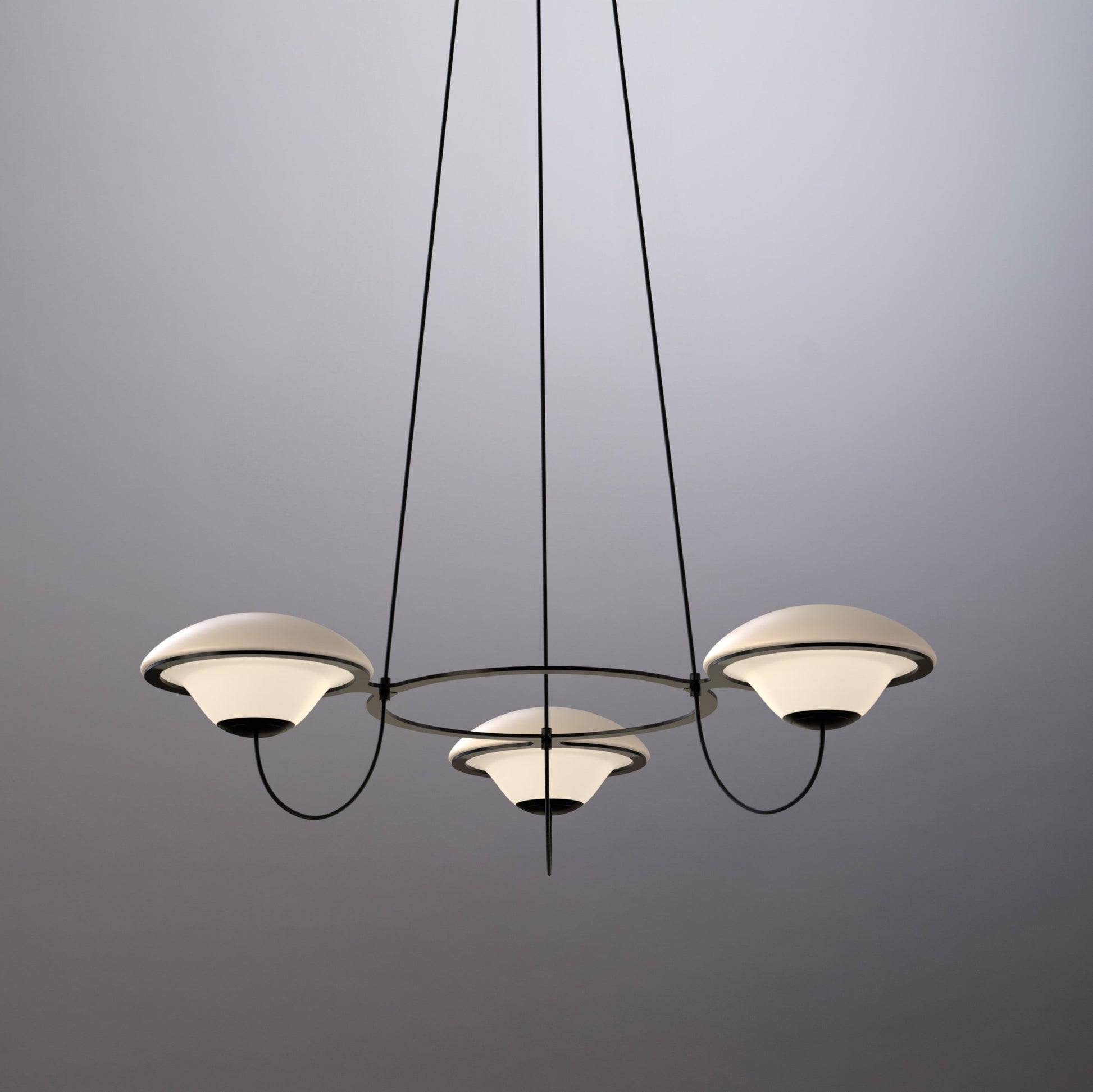 Avec ses lumières évoquant des OVNI, le lustre In the Air, créé par Douglas Mont, s'inscrit dans ce répertoire où le fantastique rétro-futuriste rencontre la science-fiction nostalgique. Visionner et revoir des bandes dessinées américaines ou des films hollywoodiens de série B peuplés de soucoupes volantes permet de saisir l'impact de cet arsenal lumineux, opérant par flottes de trois ou six engins. Lumineux, biomorphique, reposant sans ancrage sur des cercles métalliques, à l'instar de certaines lampes totémiques italiennes des années 1960, In the Air se positionne en équilibre spatial, tel une station aérienne opalescente en lévitation.