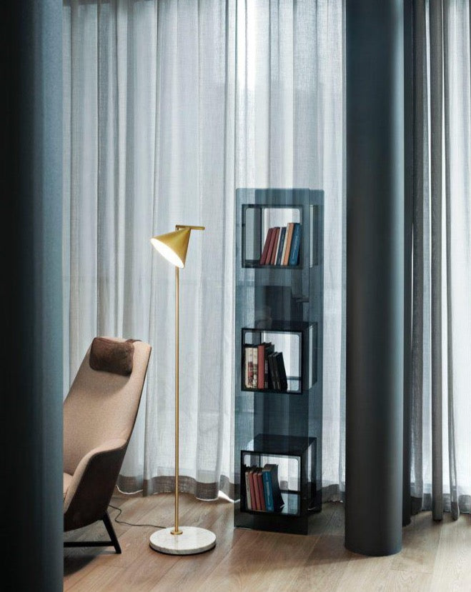Le lampadaire Captain Flint de Flos est minimaliste et élégant, et se marie parfaitement avec le précieux socle en marbre : l'aspect classique du laiton associé aux tons intemporels du marbre blanc de Carrare ; l'anthracite moderne mêlé au marbre Marquina : de fines veines argentées et blanches qui texturent un fond sombre.