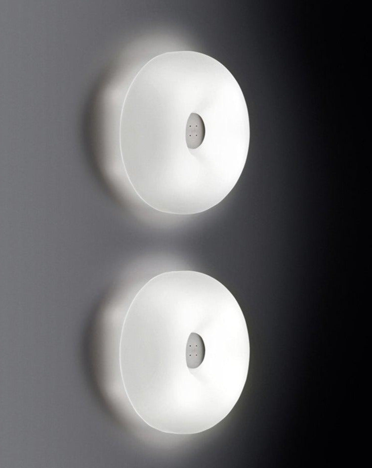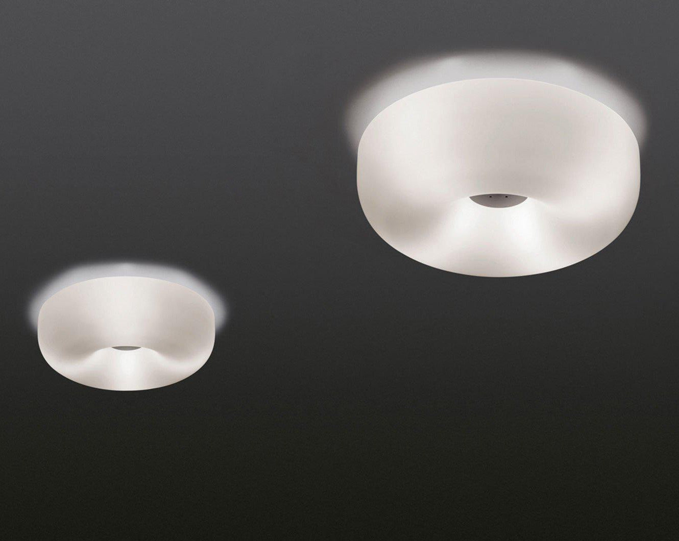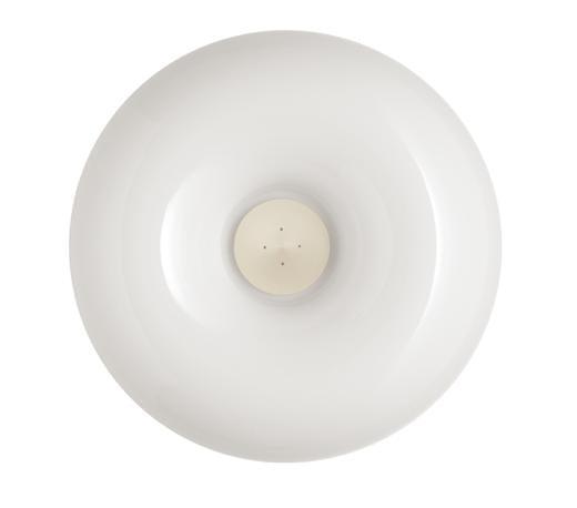 Le plafonnier/applique Circus de Foscarini est un volume en verre soufflé doux qui éclaire sans créer d'éblouissement, avec un bouton en métal qui le distingue et le décore.