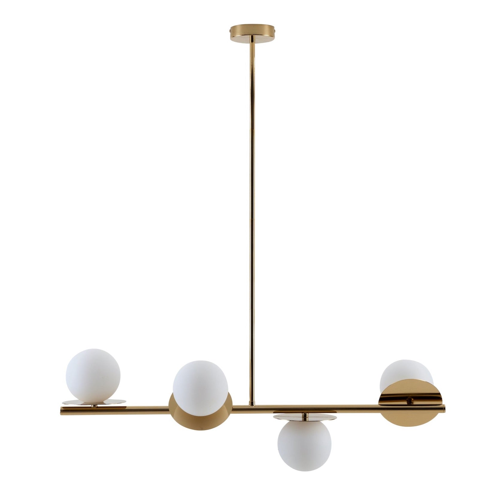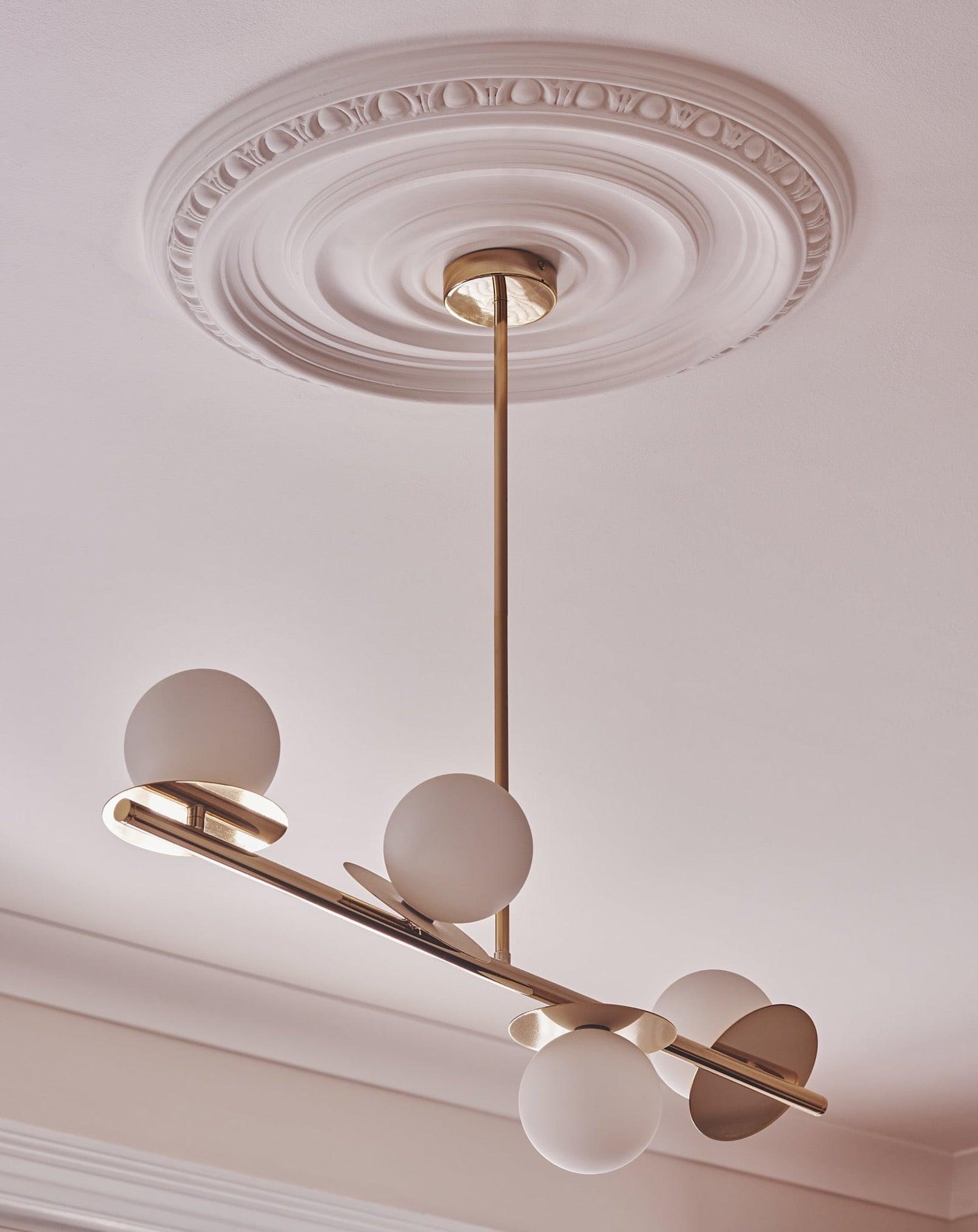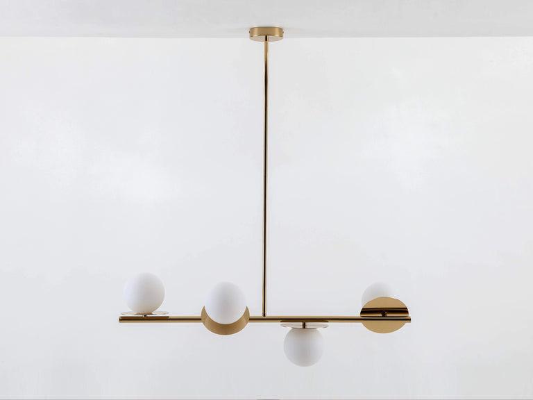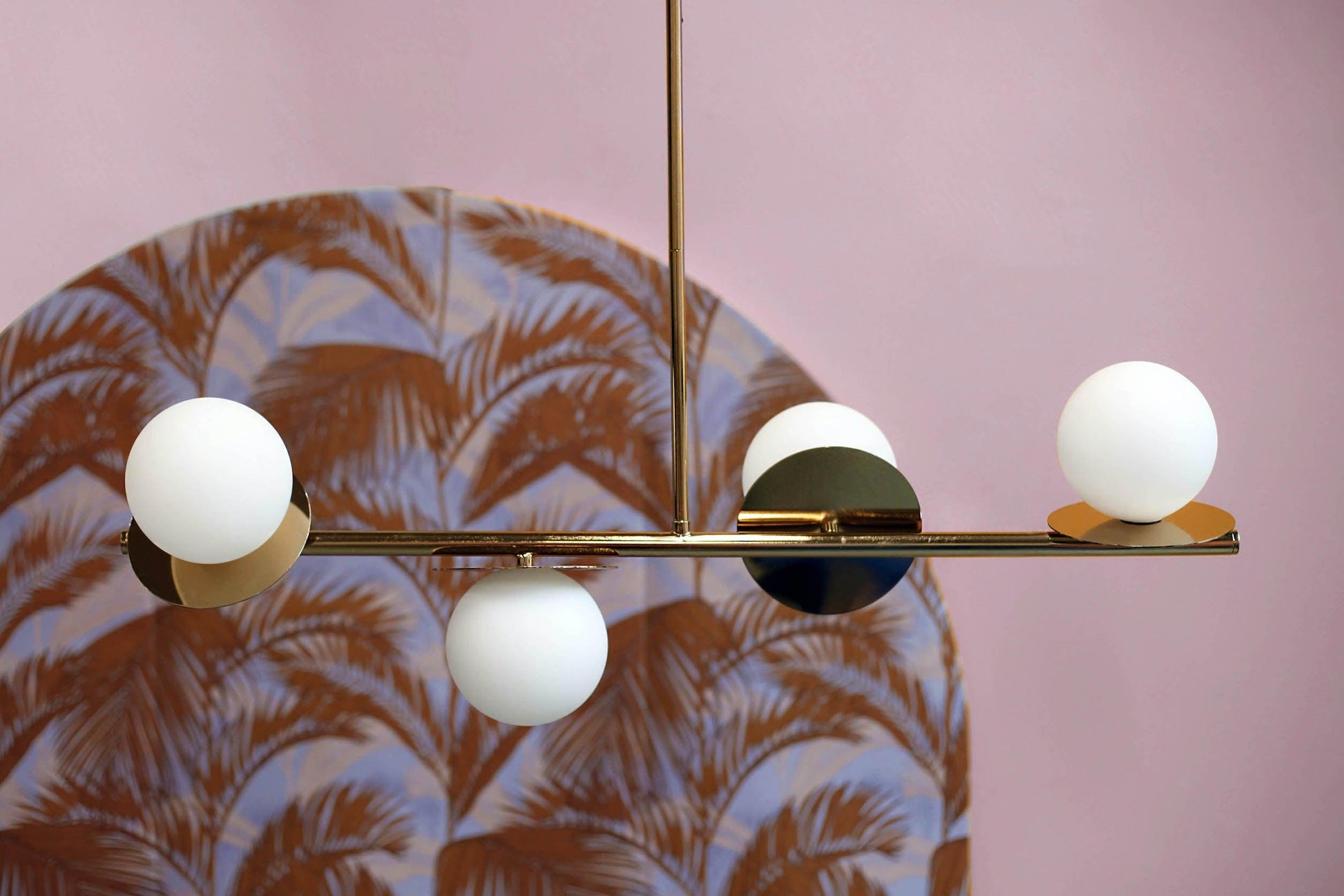 Le plafonnier Brass Opal Disk, de Houseof. Ce luminaire au design contemporain se compose d'une tige métallique allongée soutenant quatre abat- jour en verre opale fixés sur des disques. Ces abat-jour élégants, orientés dans différentes directions, diffusent une lumière homogène dans vos espaces de vie. La hauteur de suspension est réglable, ce qui permet d'adapter ce luminaire aux plafonds hauts comme aux plafonds bas, où son format compact est particulièrement appréciable.