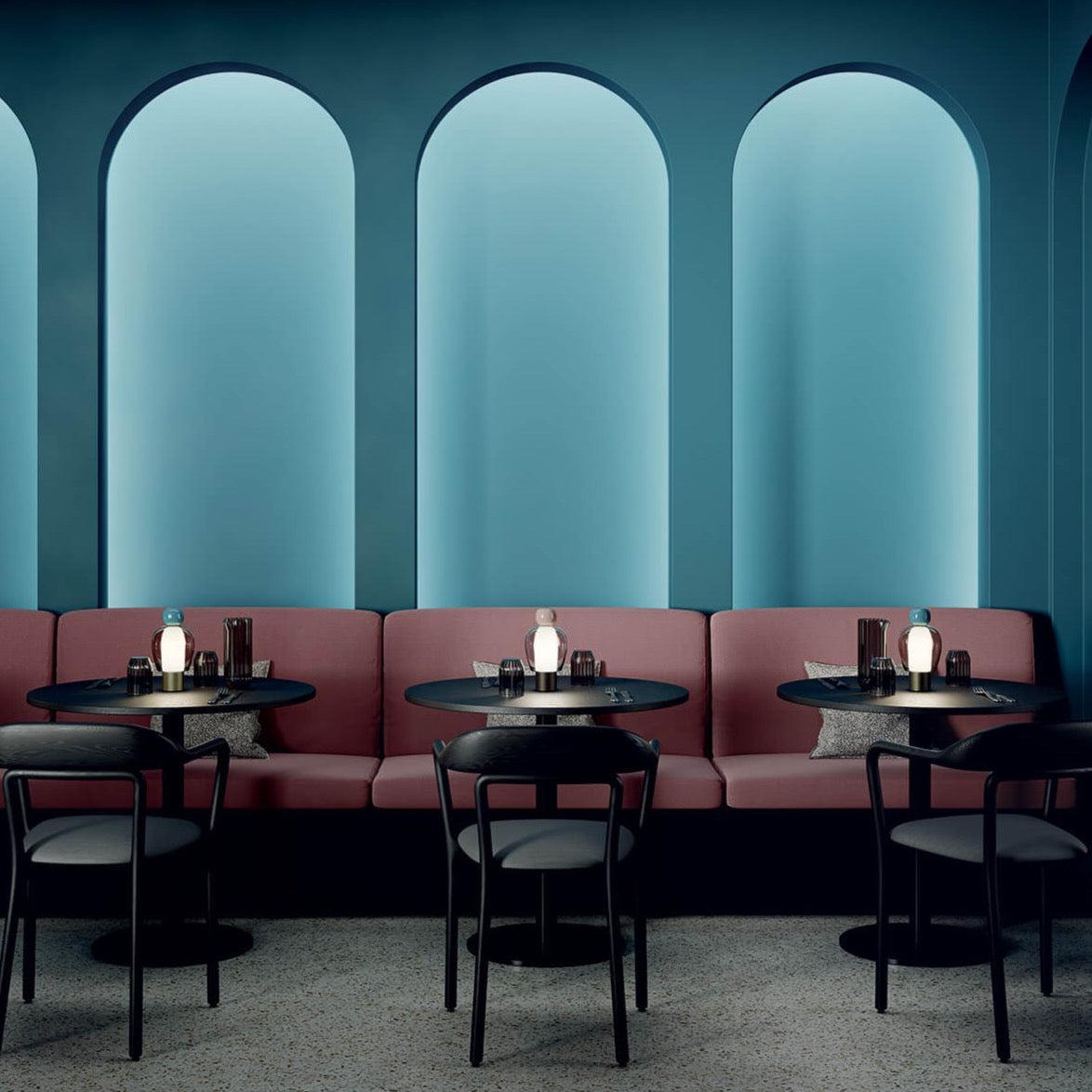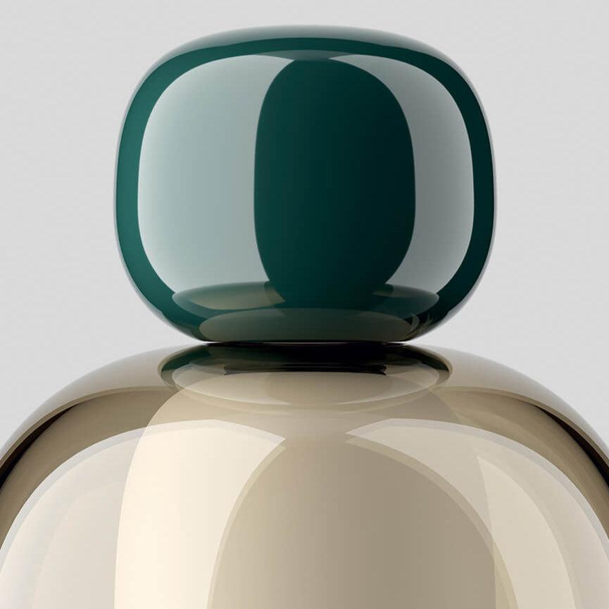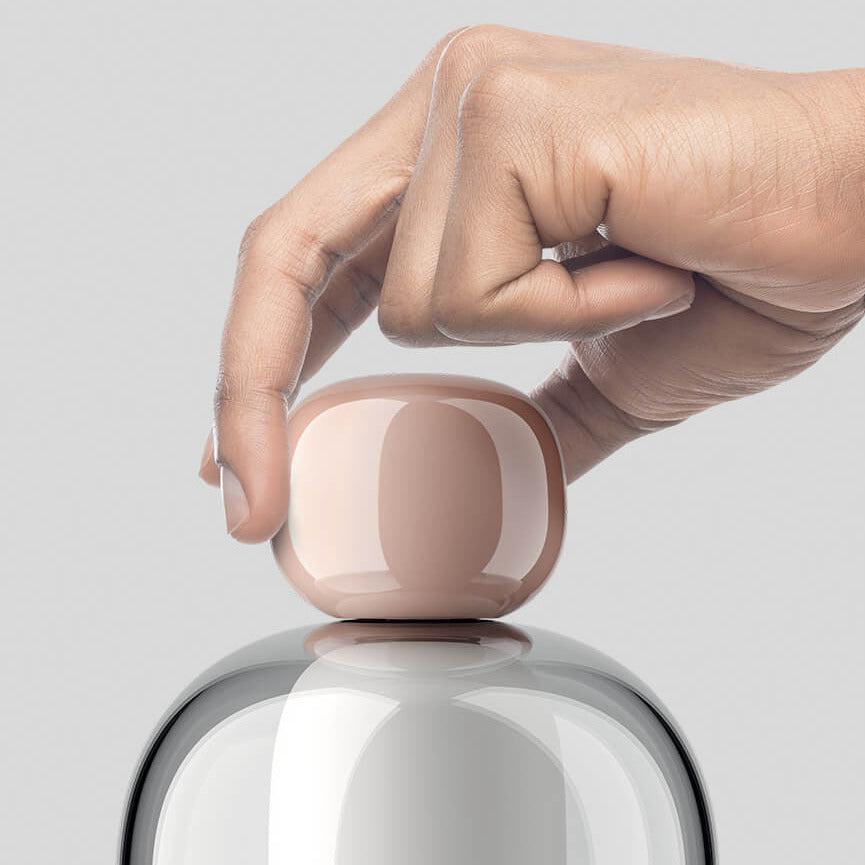 Disponible en quatre coloris (Flamant rose, Lagon, Algues, Châtaigne), chaque lampe se compose de deux éléments : un corps et un pommeau. Le corps de la lampe est constitué d’une base métallique abritant la source lumineuse LED et un diffuseur en méthacrylate blanc, enveloppé d’une cloche en verre. Ce verre filtre la lumière et se décline en deux formes et couleurs différentes. Un pommeau arrondi permet d’allumer et d’éteindre la lampe, ainsi que de régler l’intensité et la température de la lumière.