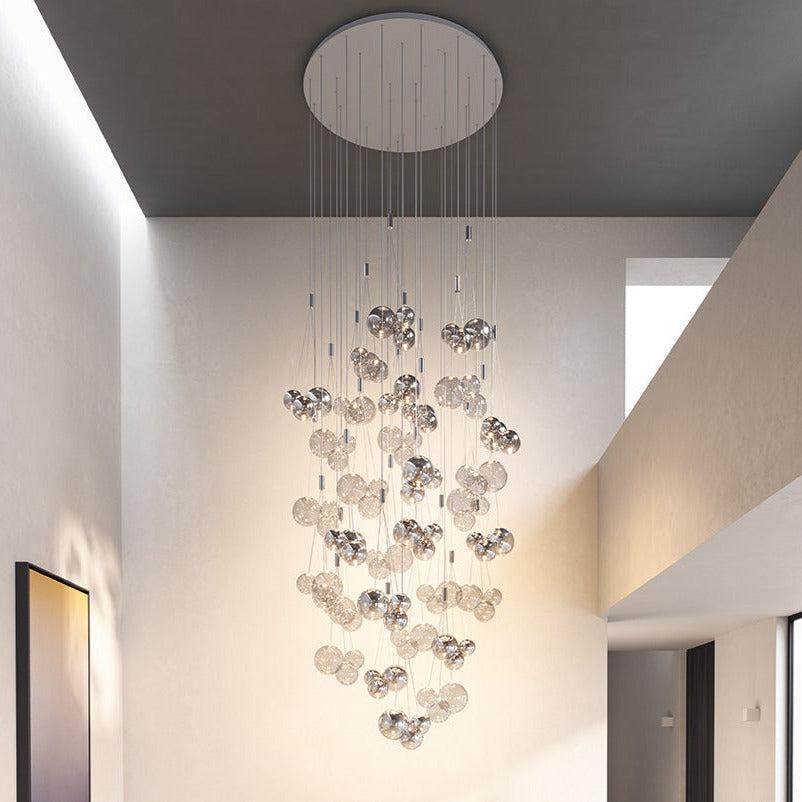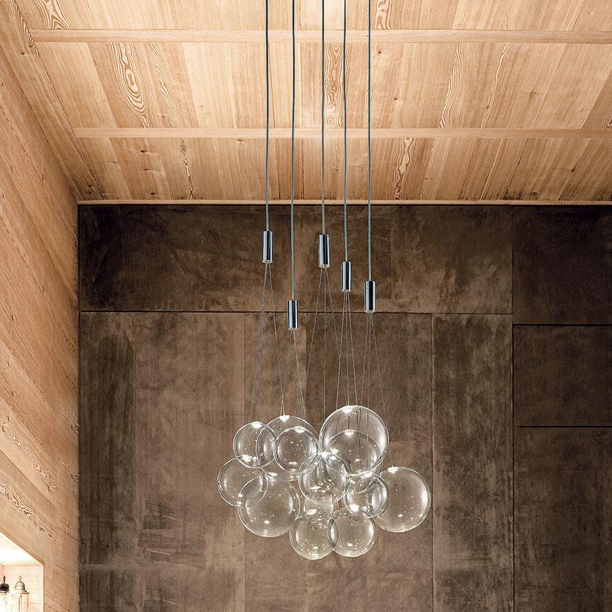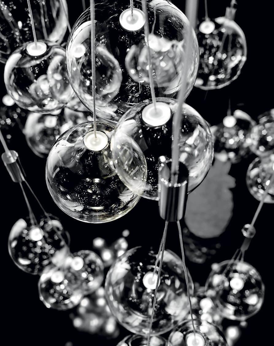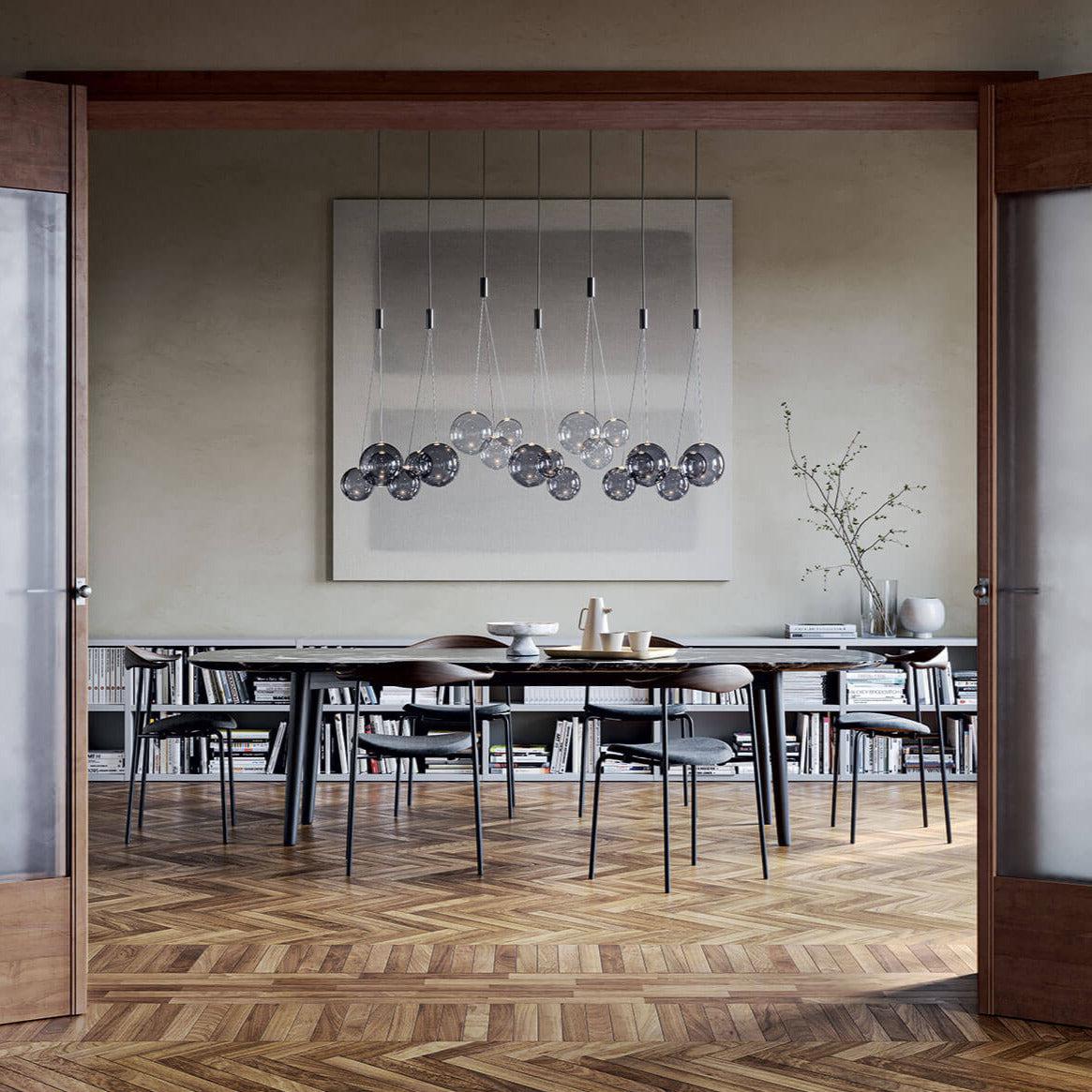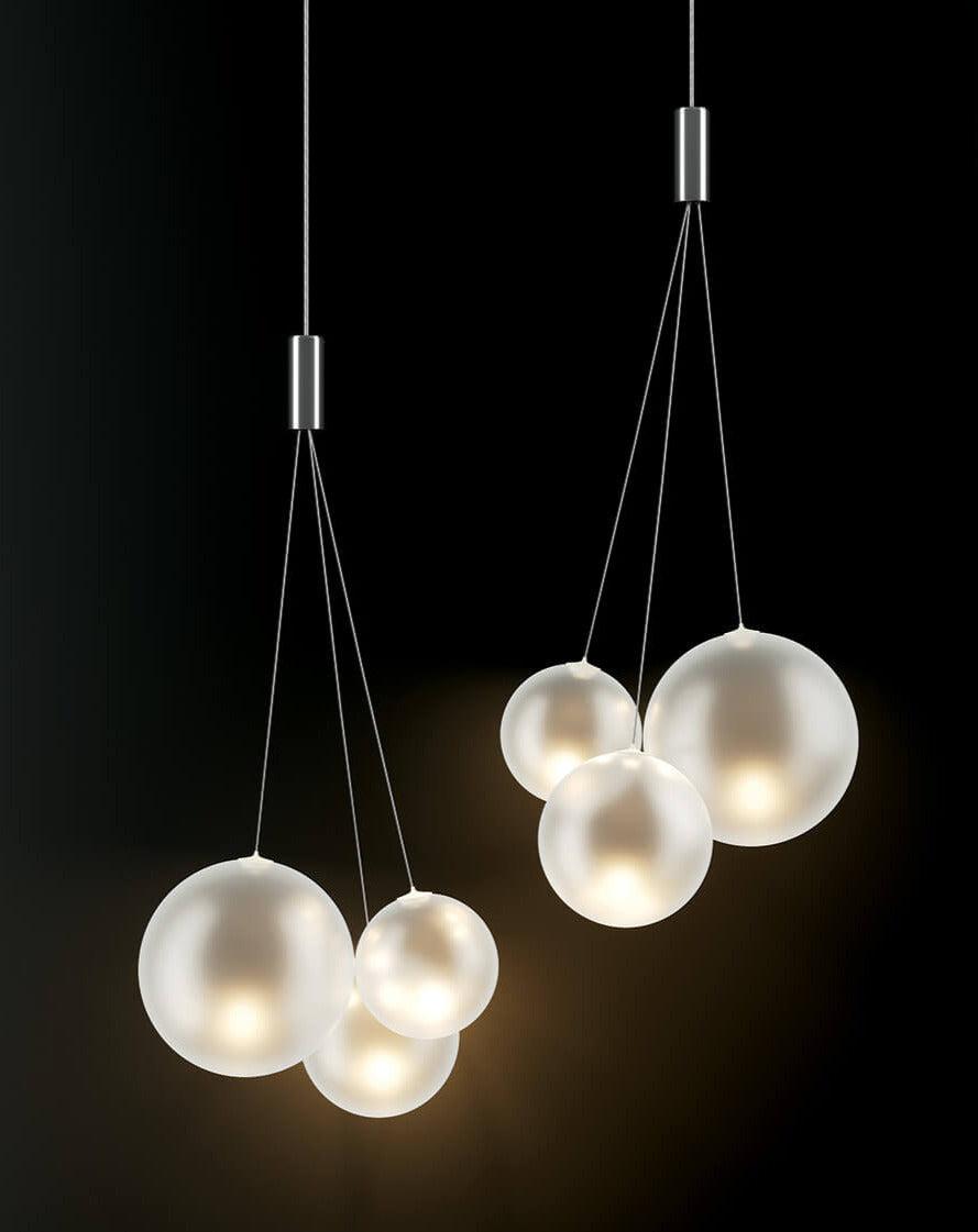 La suspension Random de Lodes, en verre soufflé léger, se compose de trois diffuseurs ronds de tailles différentes, formant un ensemble simple et captivant. Chaque diffuseur abrite une LED qui émet une douce lumière blanche. Regroupées en grappe, les suspensions Random créent une composition poétique évoquant des bulles de savon, sublimée par des finitions contemporaines qui lui confèrent caractère et originalité.