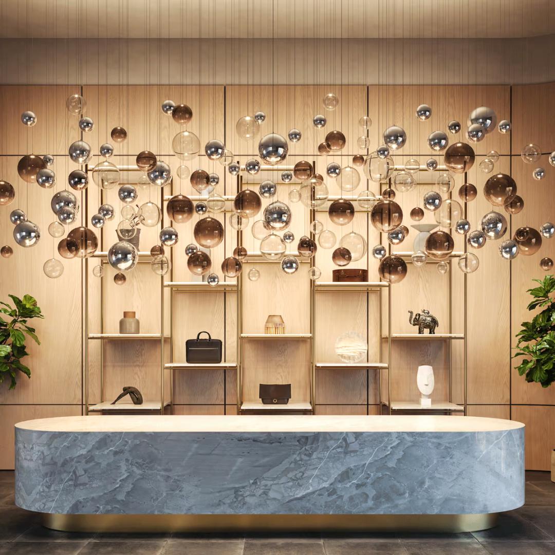 Le verre transparent, le nouveau verre blanc dépoli et les quatre finitions métalliques dégradées originales (chrome, or, or rose, fumé brillant) peuvent être combinés à volonté comme dans un jeu enchanteur de bulles lumineuses.
