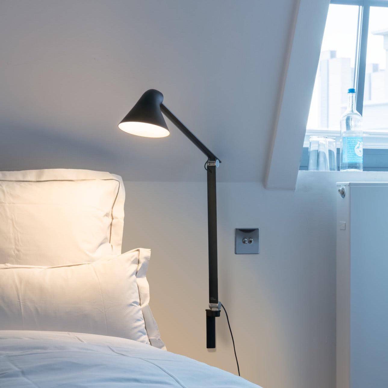 L'applique murale NJP de Louis Poulsen offre un éclairage horizontal direct et non éblouissant, tout en réfléchissant une partie de la lumière à l'arrière de la tête, illuminant ainsi le haut du bras. La conception ergonomique de la tête d'applique permet de modeler la lumière et d'optimiser son orientation. Un système mécanique simple offre une grande liberté de mouvement, permettant ainsi de positionner l'applique toujours de manière optimale dans l'espace de travail. L'abat-jour, peint en blanc à l'intérieur, diffuse une lumière douce et agréable.