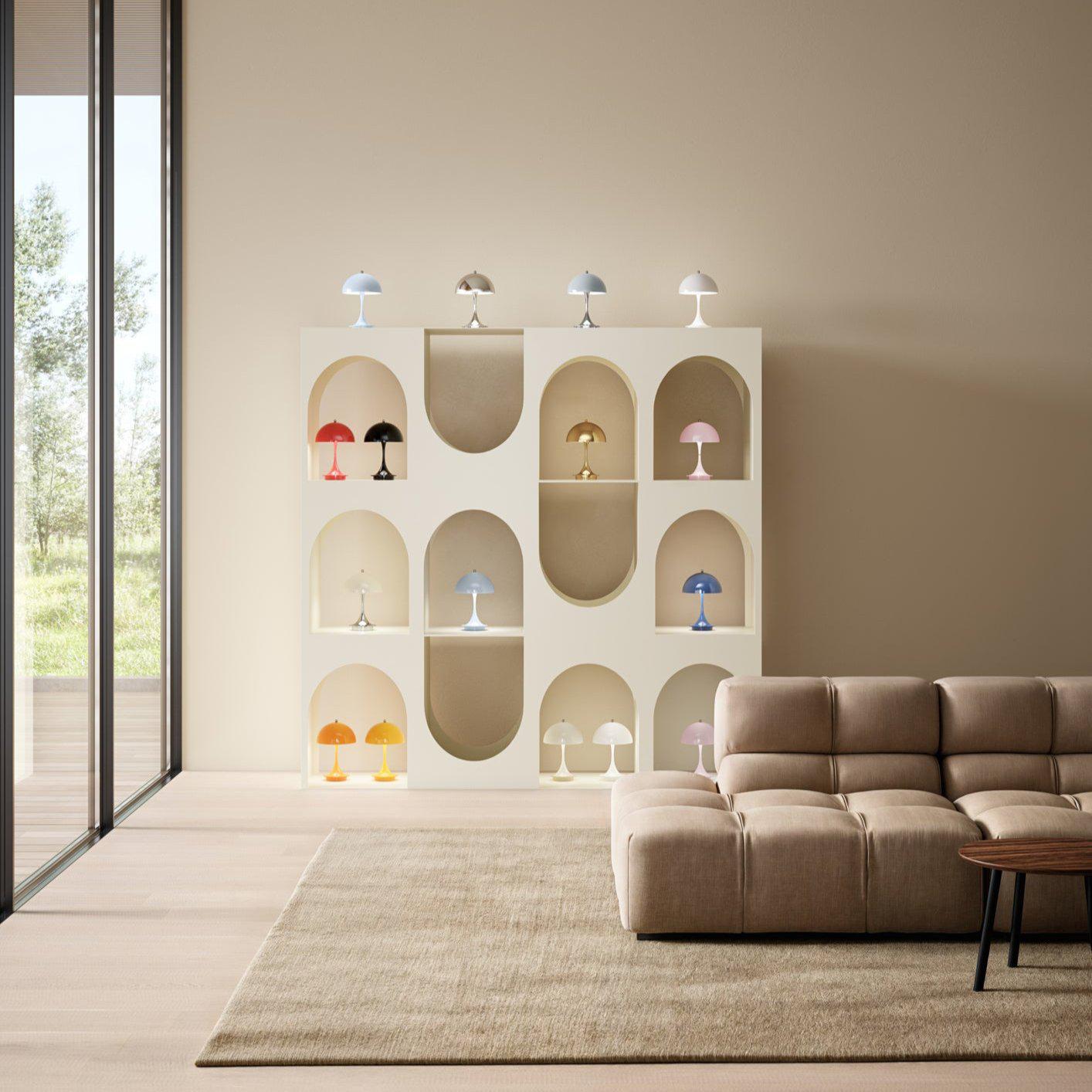La Panthella Portable peut être utilisée partout car elle ne dépend pas d'une alimentation électrique – aussi bien à l'intérieur qu'à l'extérieur, puisqu'elle est certifiée pour les endroits humides.