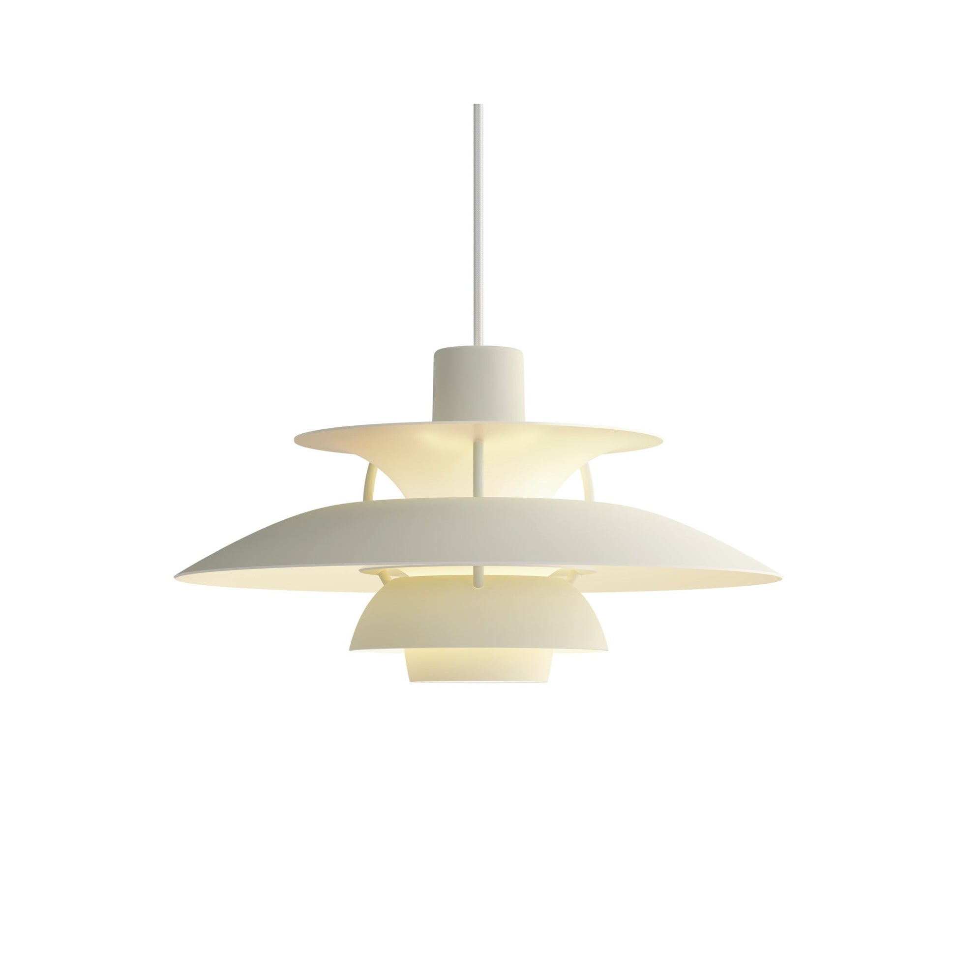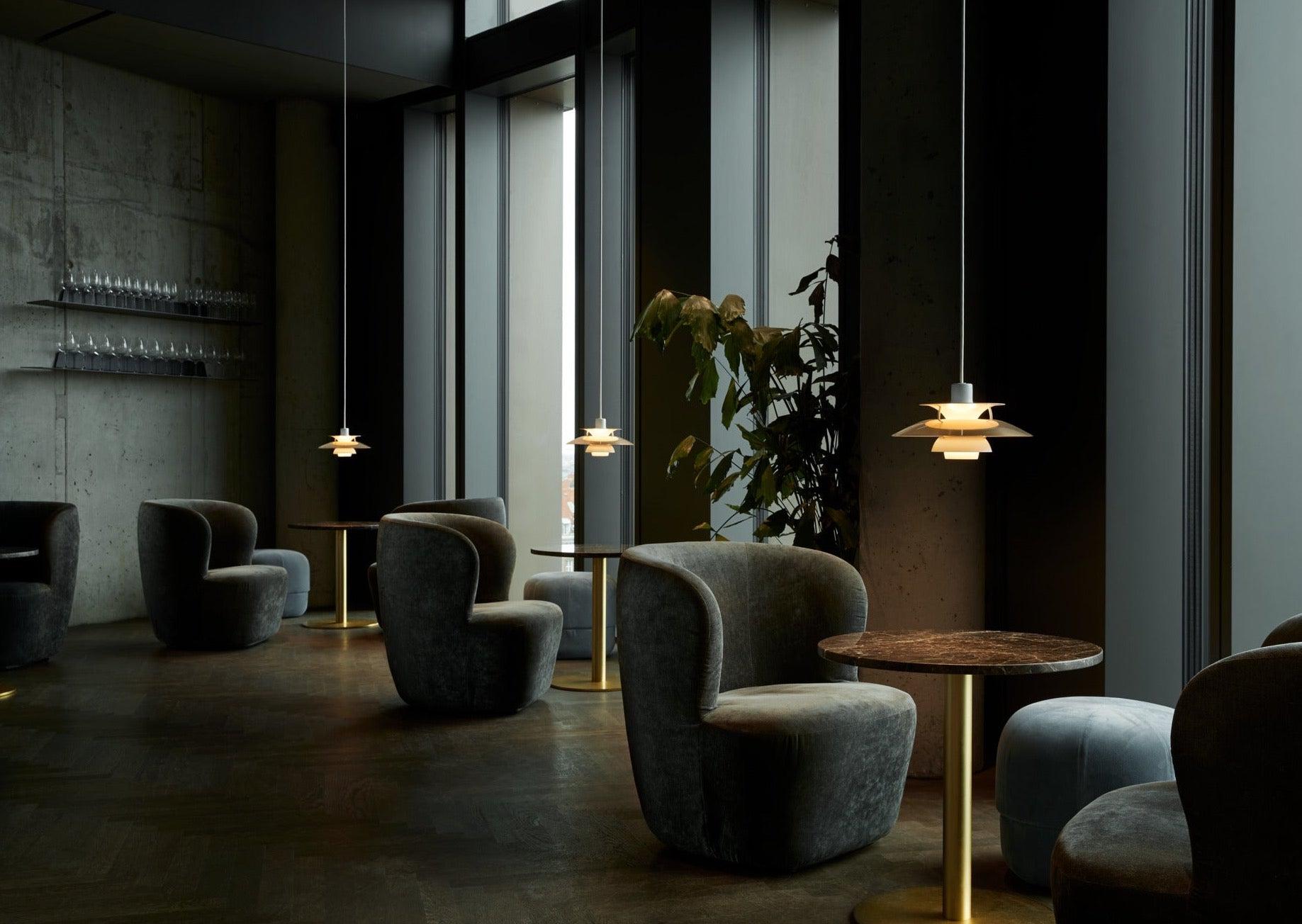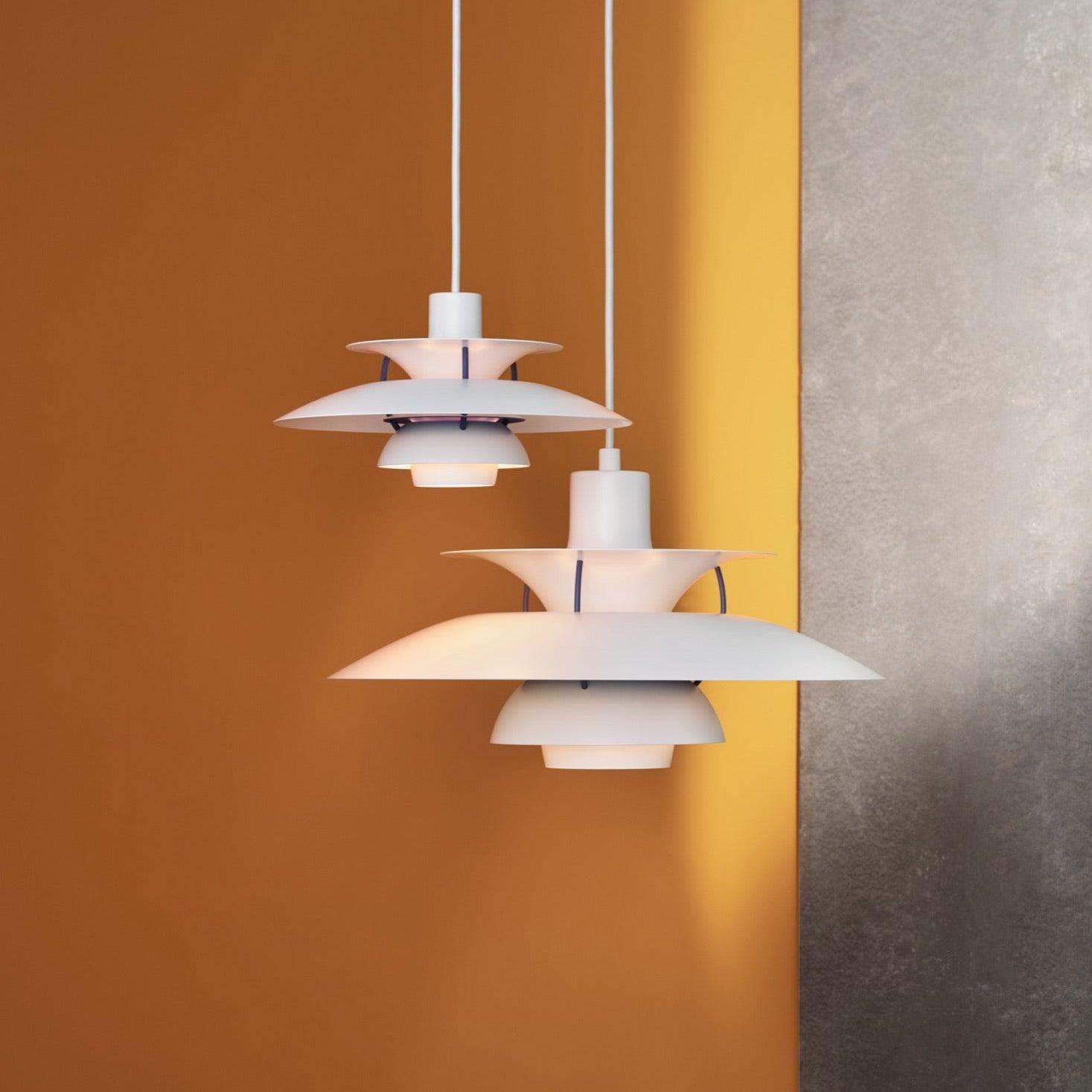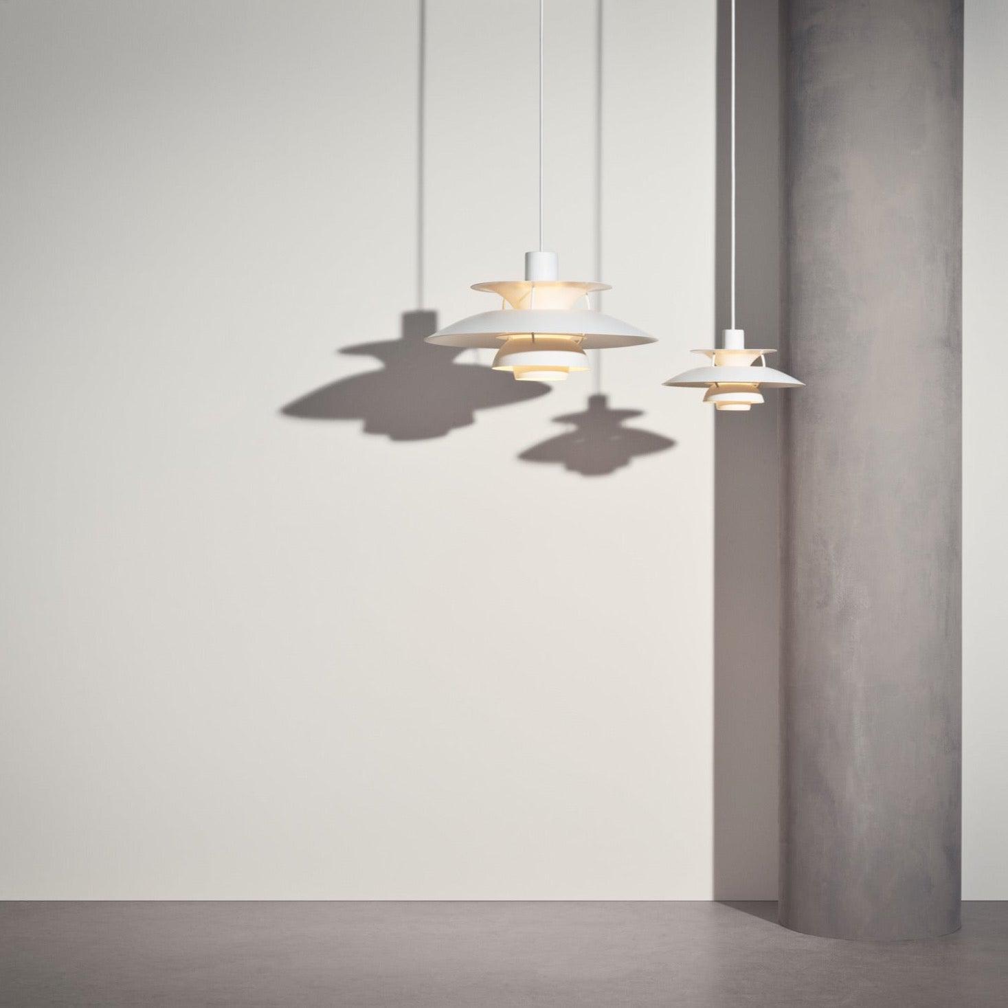 Poul Henningsen a conçu la suspension PH 5 en 1958, en réaction aux modifications constantes apportées par les fabricants à la forme et à la taille des ampoules à incandescence. Il l'a baptisée ainsi en référence au diamètre de son abat-jour principal, soit 50 cm. Aujourd'hui, la PH 5 continue d'embellir les intérieurs les plus modernes, tout comme la PH 5 Mini, lancée en 2017 dans le même esprit que la création de Poul Henningsen et dotée d'un abat-jour de 30 cm de diamètre.