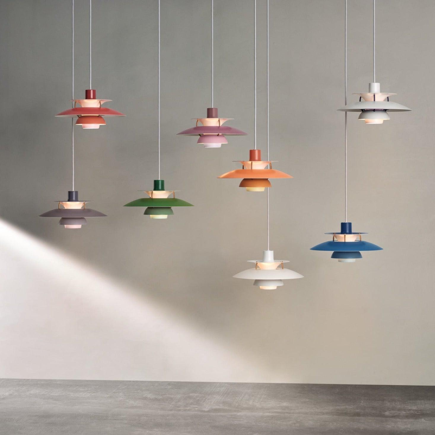 Le PH 5 Mini est disponible en Blanc Moderne, Blanc Classique, Blanc Monochrome, Bleu Monochrome, Noir Monochrome, Nuances de Bleu, Nuances d'Orange, Nuances de Rouge, Nuances de Rose, Nuances de Vert, Nuances de Gris, Cuivre et Laiton, Étain Pâle Monochrome, Rose Pâle Monochrome, Bourgogne Monochrome, Indigo Poussiéreux Monochrome.