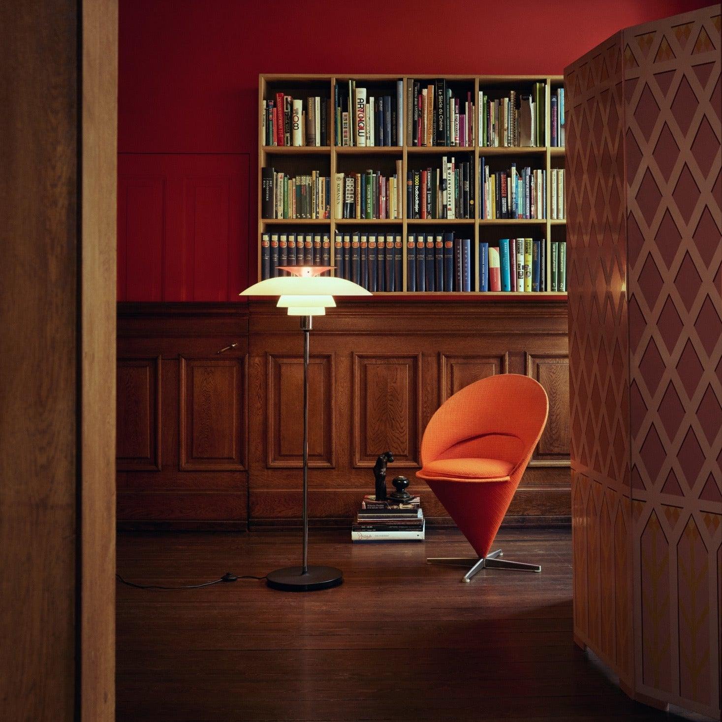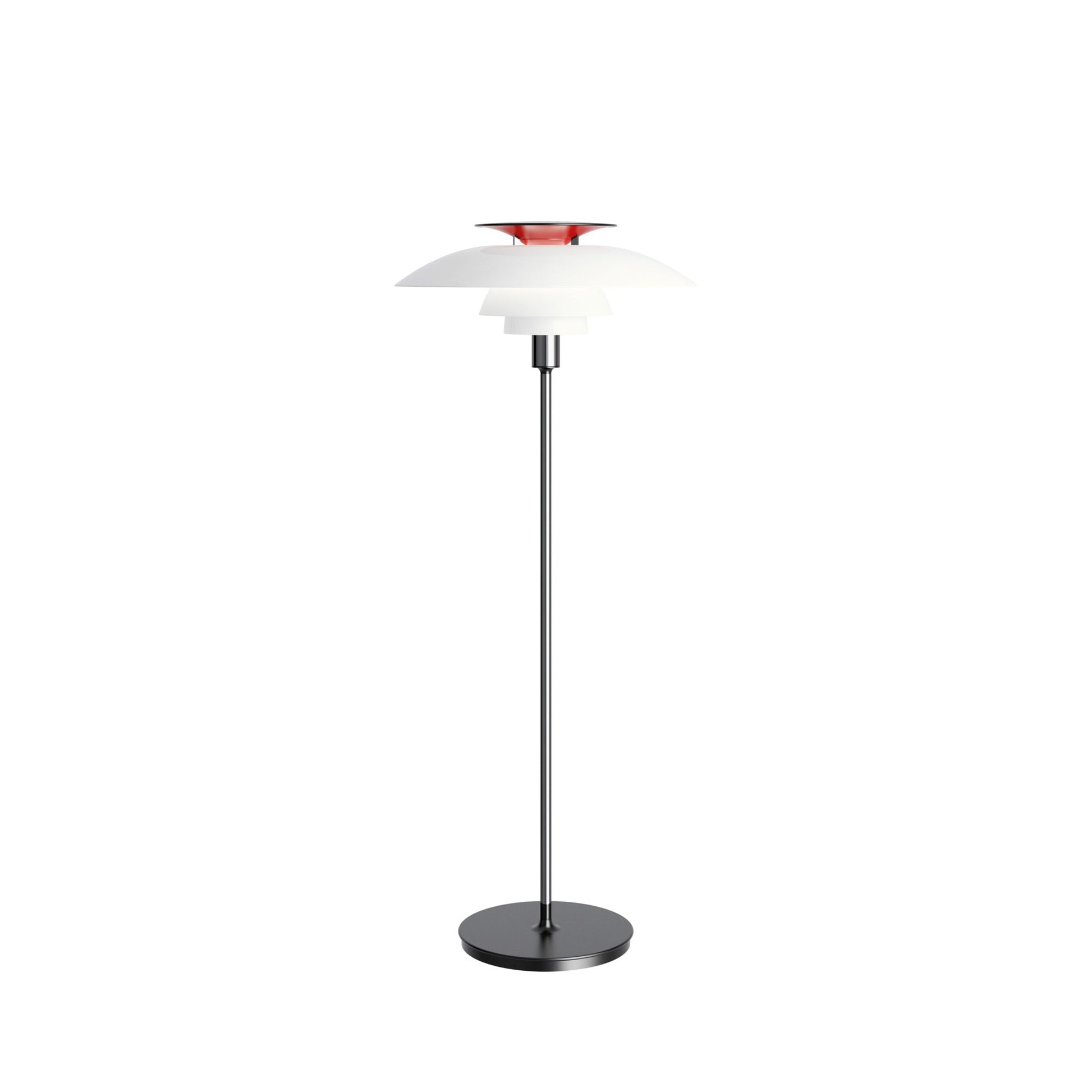 Le lampadaire PH 80 de Louis Poulsen diffuse une lumière symétrique, réfléchie et douce. La lumière est principalement dirigée vers le bas. Les abat-jour en acrylique opale offrent un éclairage d'ambiance agréable. La teinte rouge du réflecteur supérieur ajoute une lueur chaude et intense. La couleur de l'éclairage dépendra du choix de la source lumineuse.