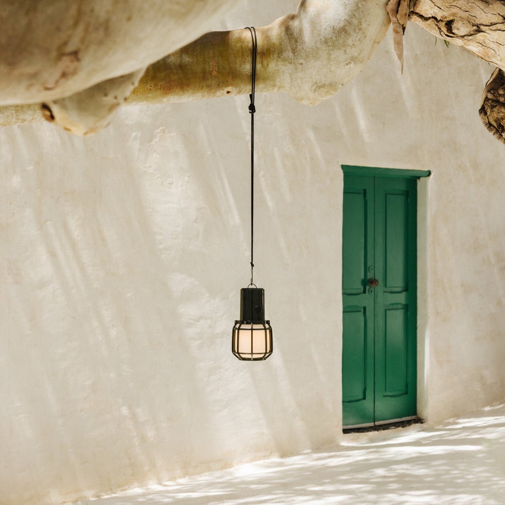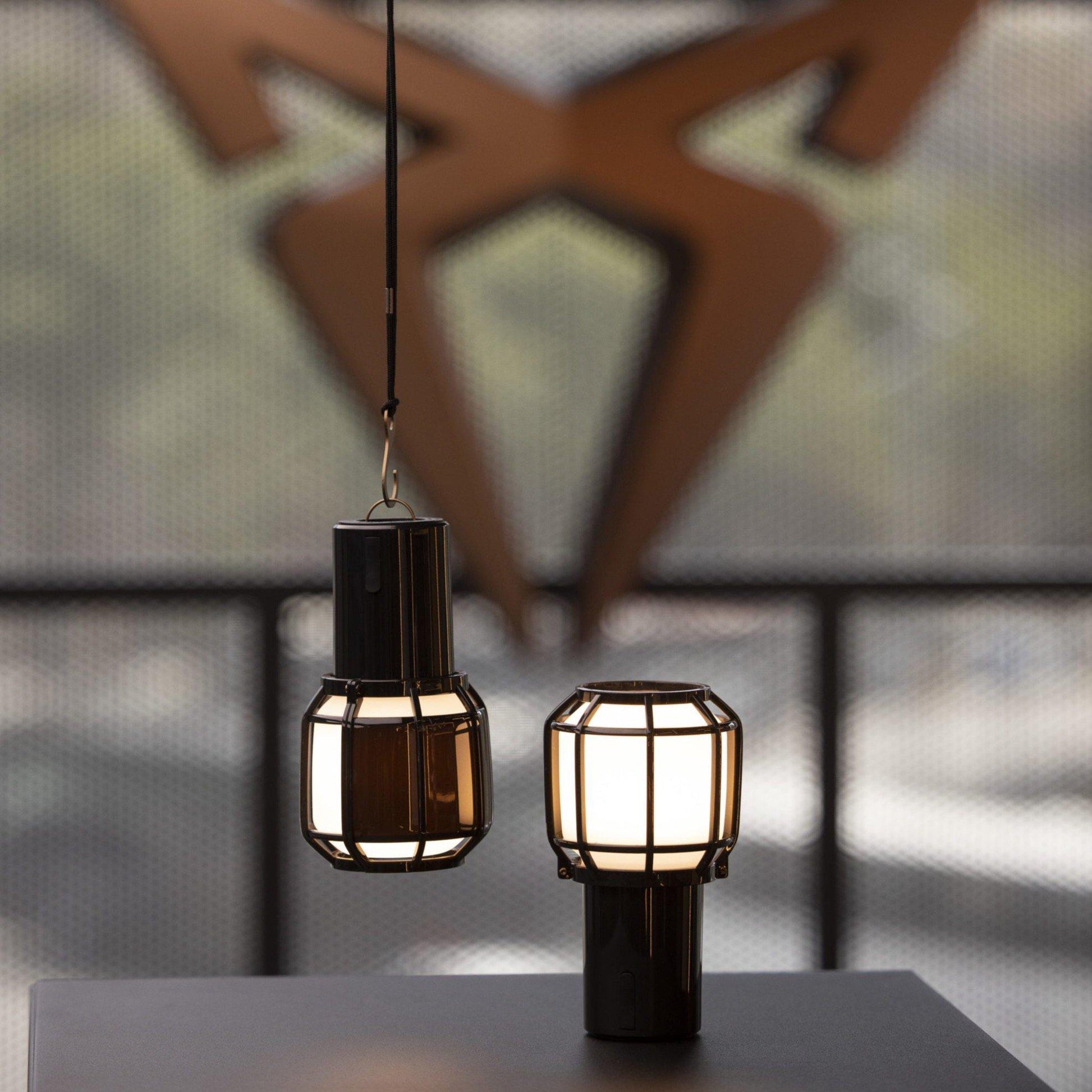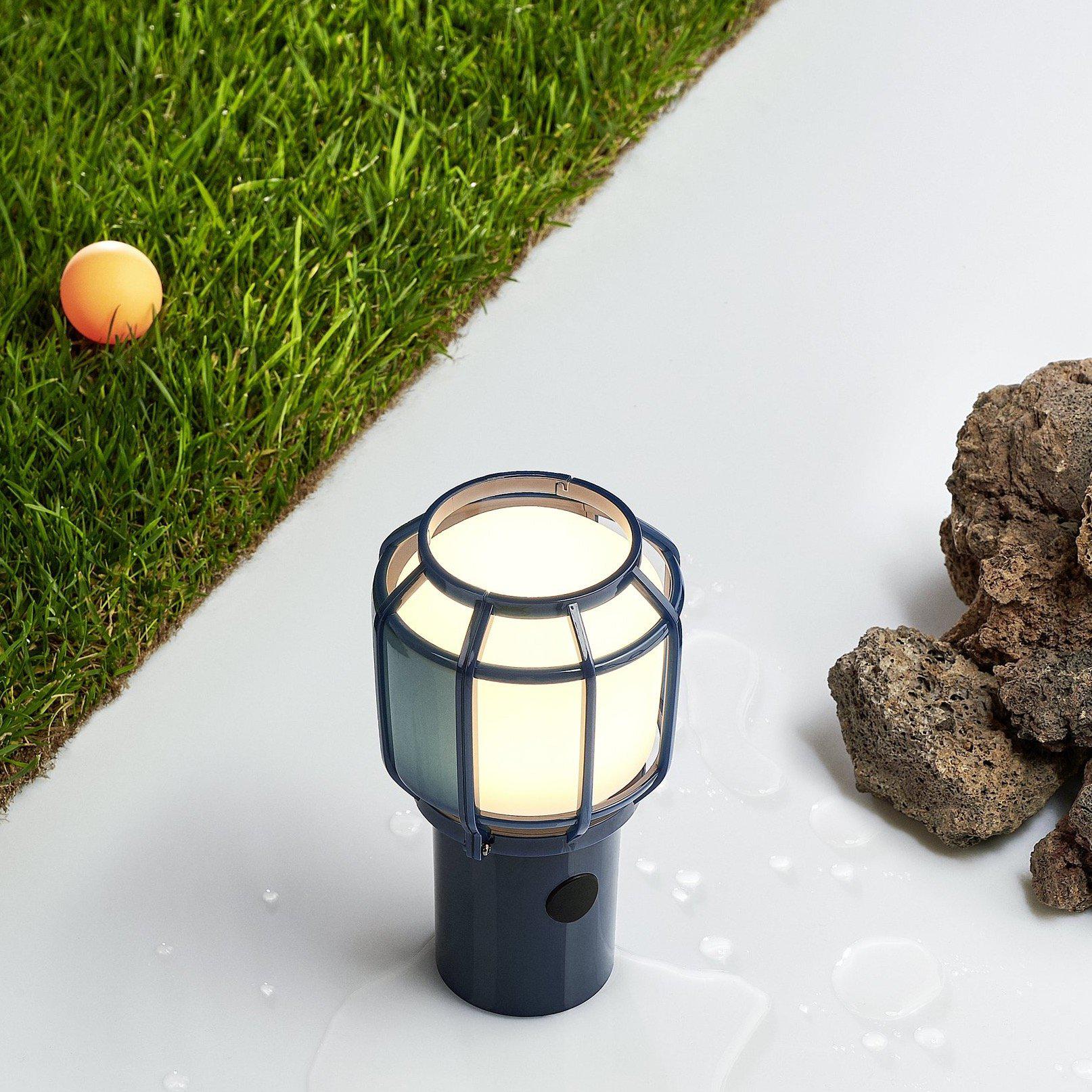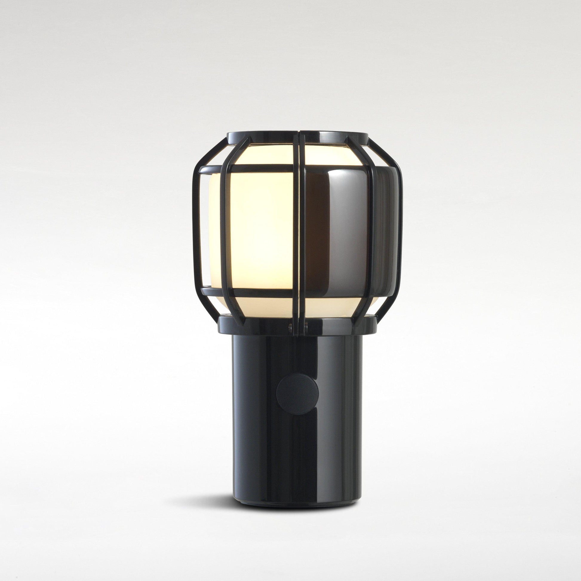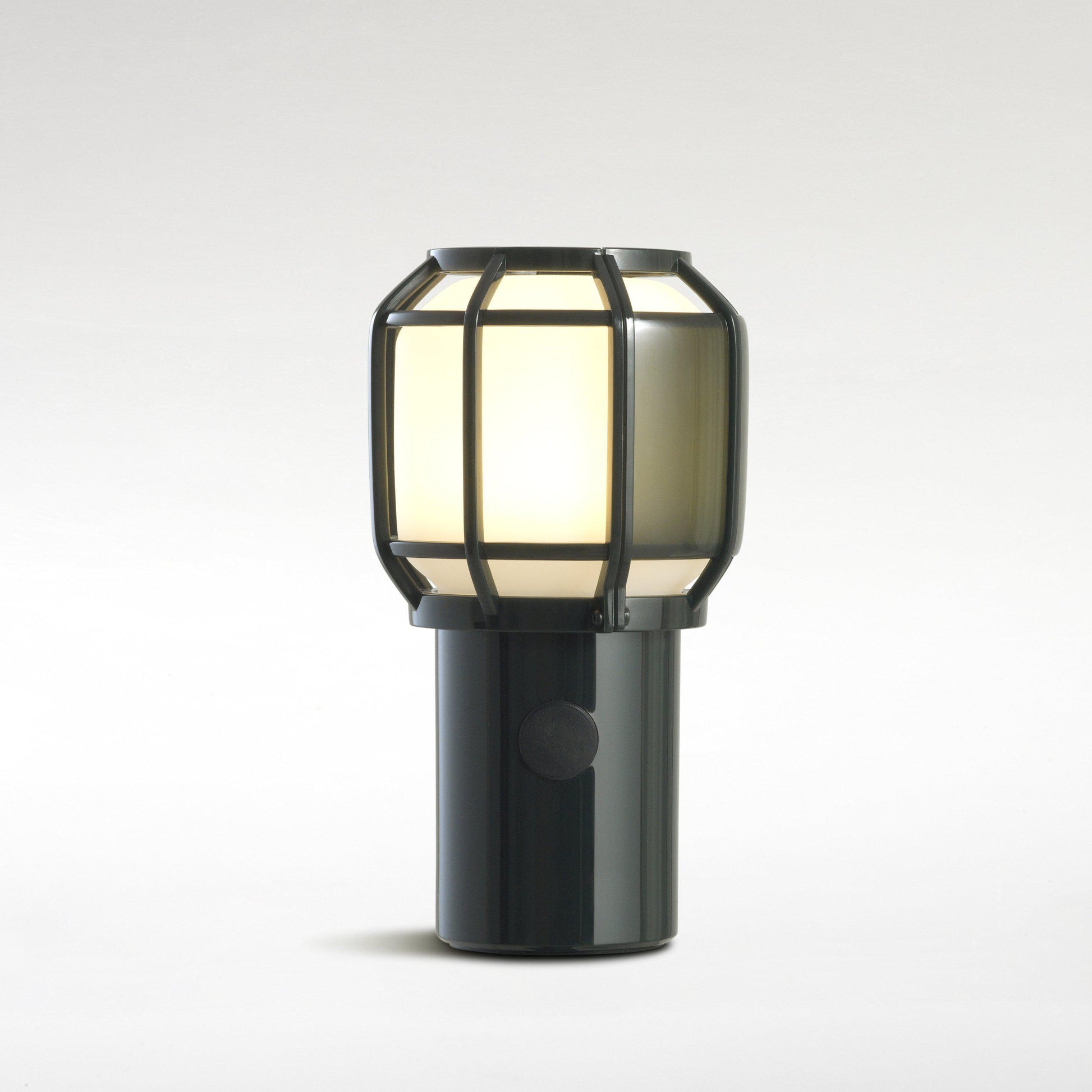 La lampe de table portable Chispa de Marset est une lampe rechargeable sans fil qui peut être laissée à l'extérieur. Chispa (Étincelle), conçue par Joan Gaspar, est certifiée étanche. Elle est également fournie avec un accessoire permettant de la suspendre.
