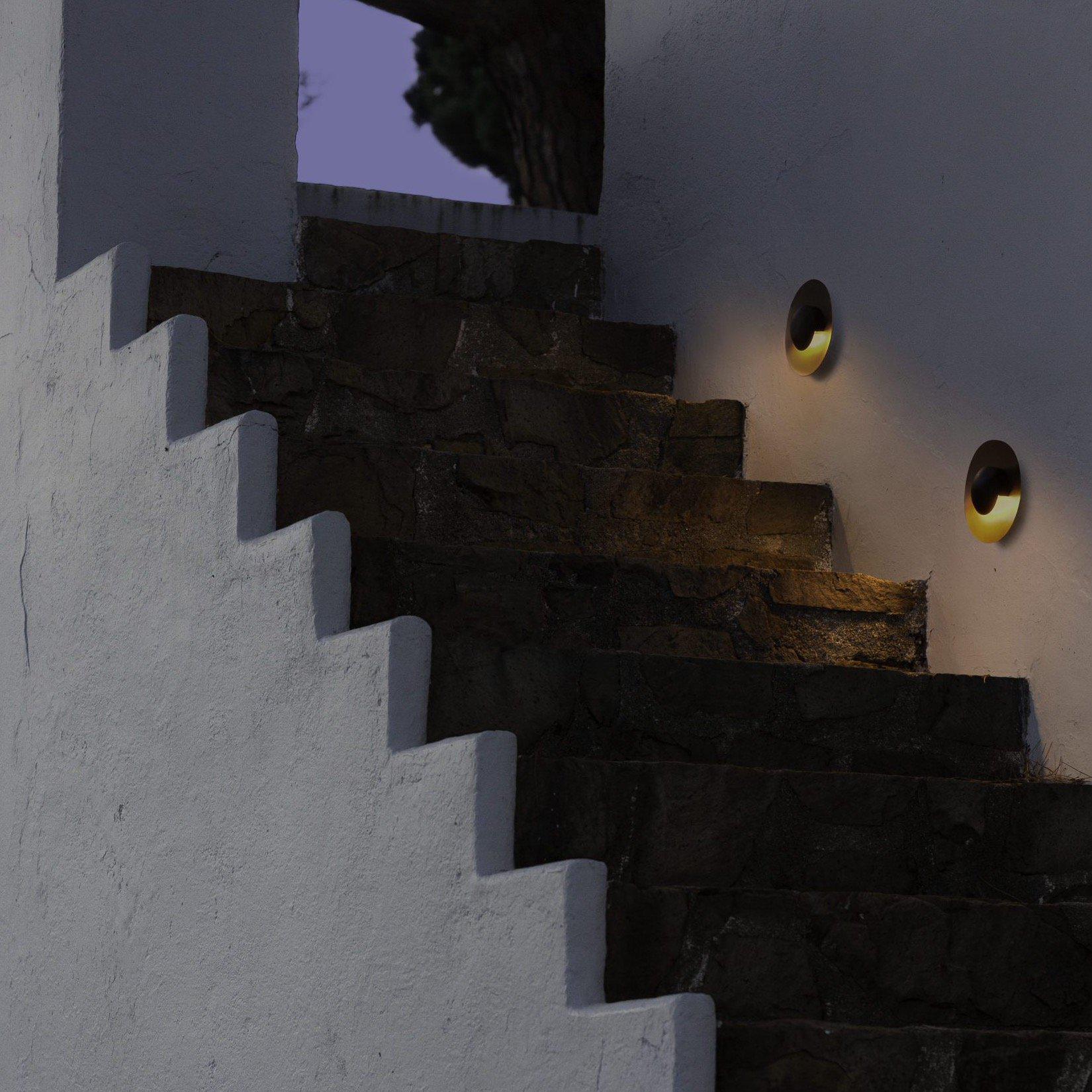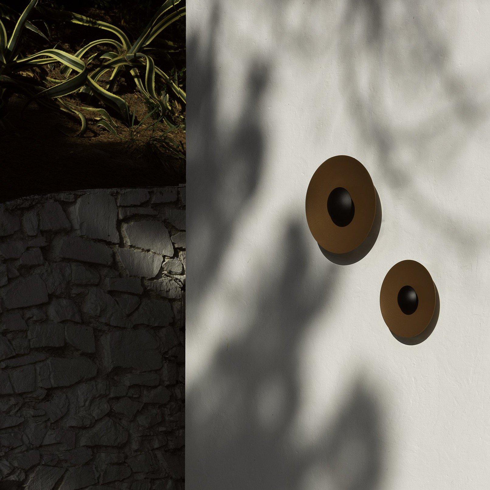 L'applique murale extérieure Ginger de Marset peut être installée seule ou en groupe et se distingue par sa finition rouille unique, offrant une lumière chaude et profonde, en plus de la finition métallique noire et blanche standard de la version intérieure. La version de 15 cm projette uniquement une lumière vers le bas, ce qui la rend idéale pour éclairer les escaliers à faible hauteur.