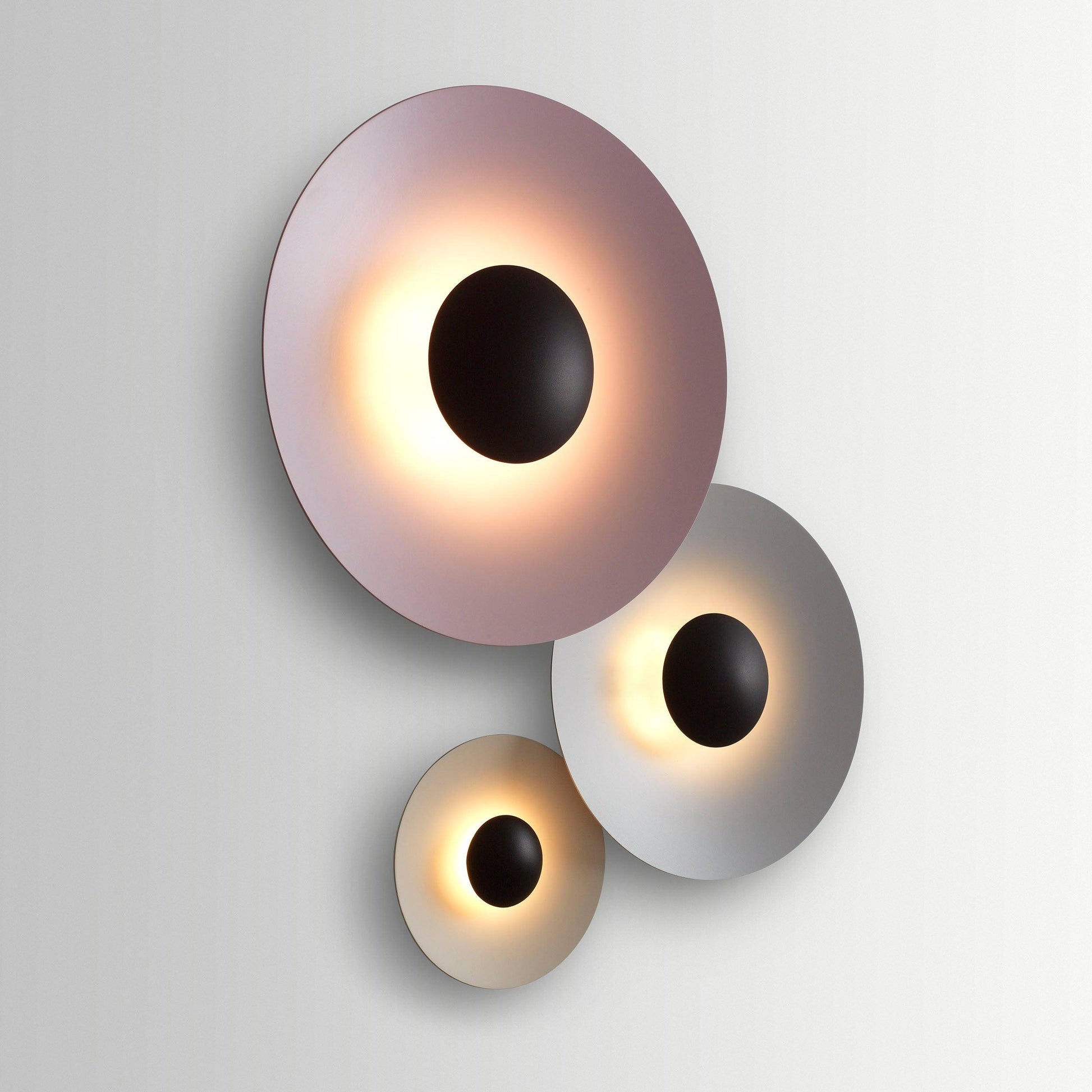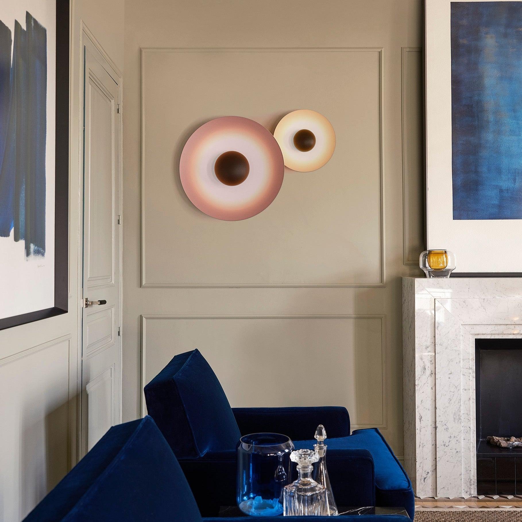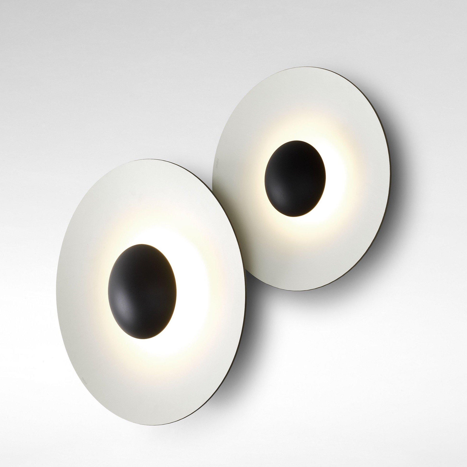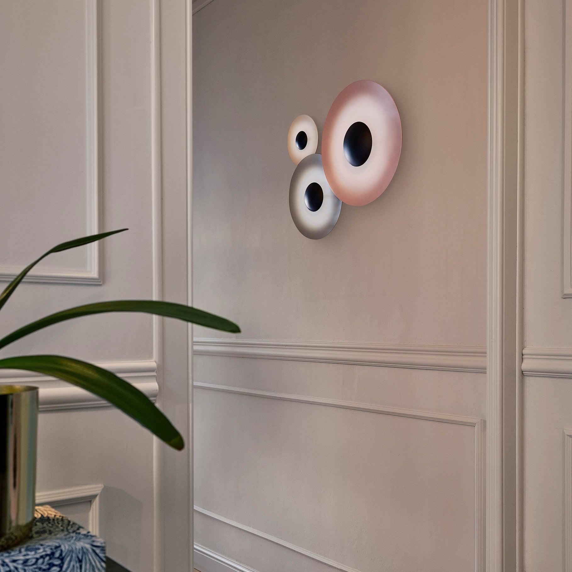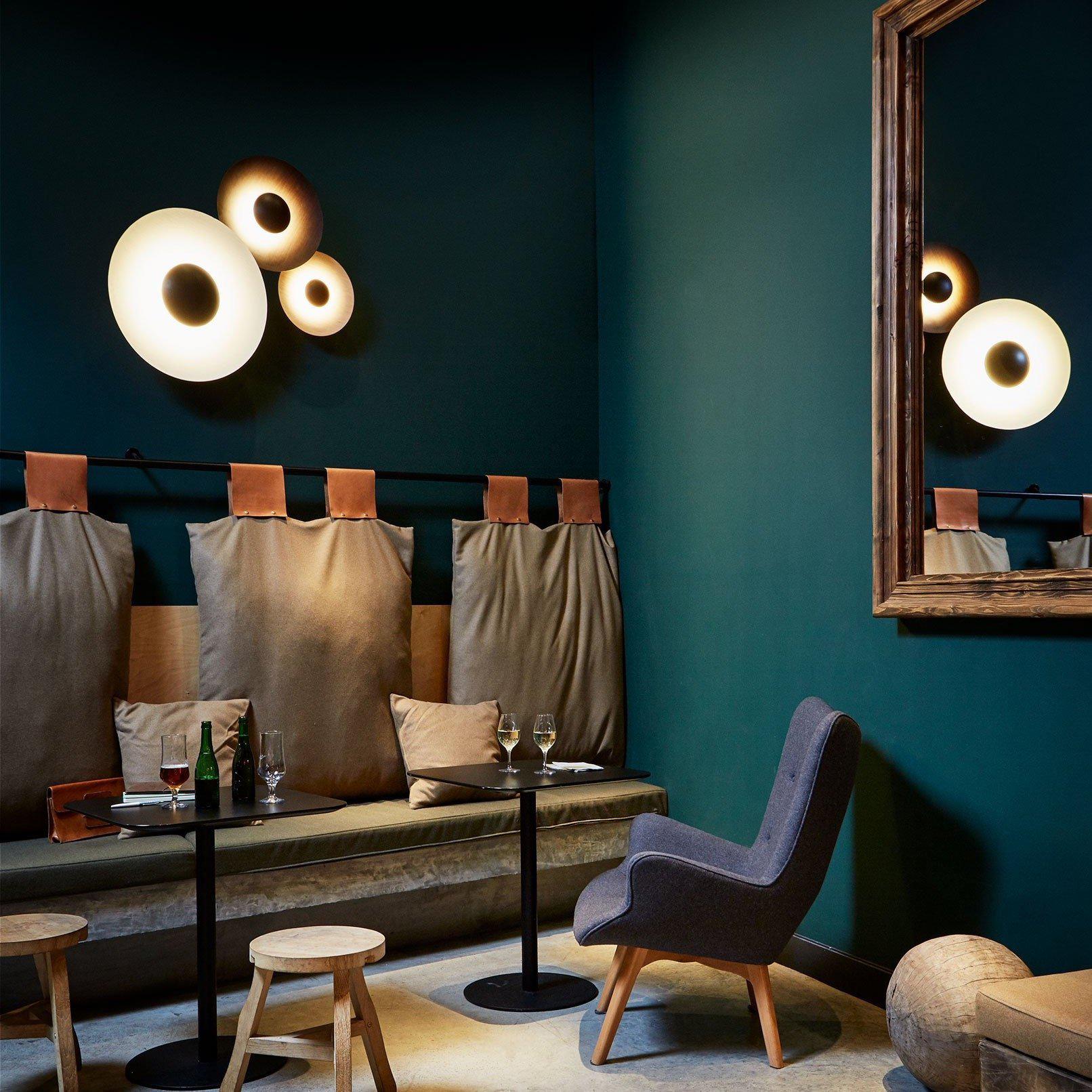 L'applique murale/plafonnier Ginger de Marset peut être installée en ensemble pour former un objet statique, presque artistique, des cercles où la finition métallique est lisse au toucher et agréable à l'œil.