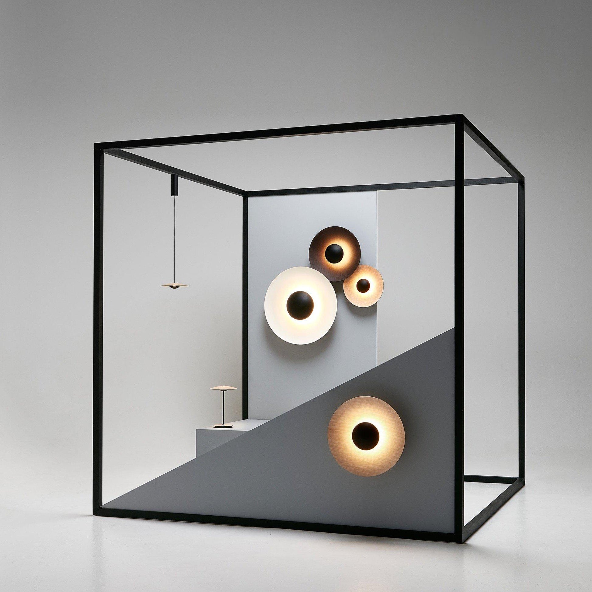 Le luminaire Ginger est également disponible en métal, offrant la même lumière chaude et diffuse, sans éblouissement, qui met en valeur les espaces. Ce matériau est appliqué à certains modèles de la collection avec différentes finitions : laiton brossé, noir ou blanc à l’extérieur, et laiton brossé ou blanc à l’intérieur. Une option plus légère, plus raffinée, presque sculpturale.