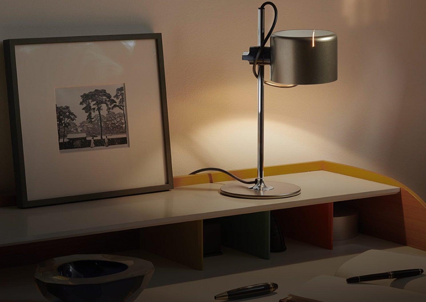 La Mini Coupé , avec sa tige chromée et son abat-jour semi-cylindrique, conserve le profil distinctif et le caractère audacieux qui définissent la collection Coupé et qui en ont toujours fait une gamme d'éclairage exceptionnellement moderne, désormais encore plus complète.