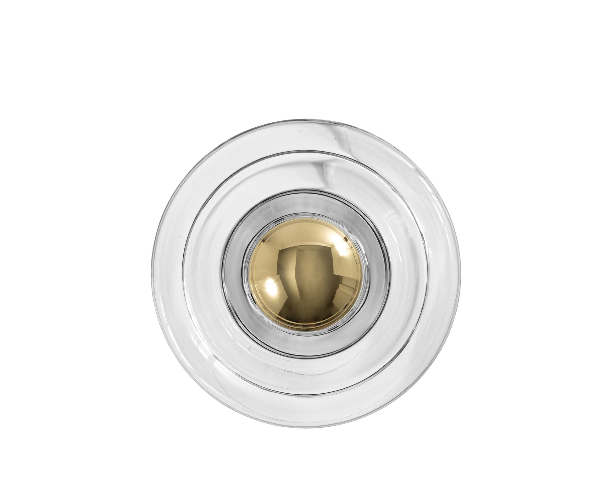 Press, de Tom Dixon, est une série de luminaires fabriqués à partir du verre le plus épais et le plus transparent, aux lignes arrondies et harmonieuses. Leurs formes évoquent les bouées de navigation et les jouets d'enfants. Le verre nervuré diffuse la lumière et projette des motifs linéaires et rayés. Audacieuse par sa silhouette et simple par son fonctionnement, Press est fabriquée en versant d'énormes blocs de verre en fusion à 1 200 degrés Celsius, puis en les pressant dans des moules en fer sous une pression considérable, ce qui confère aux luminaires une durabilité exceptionnelle.