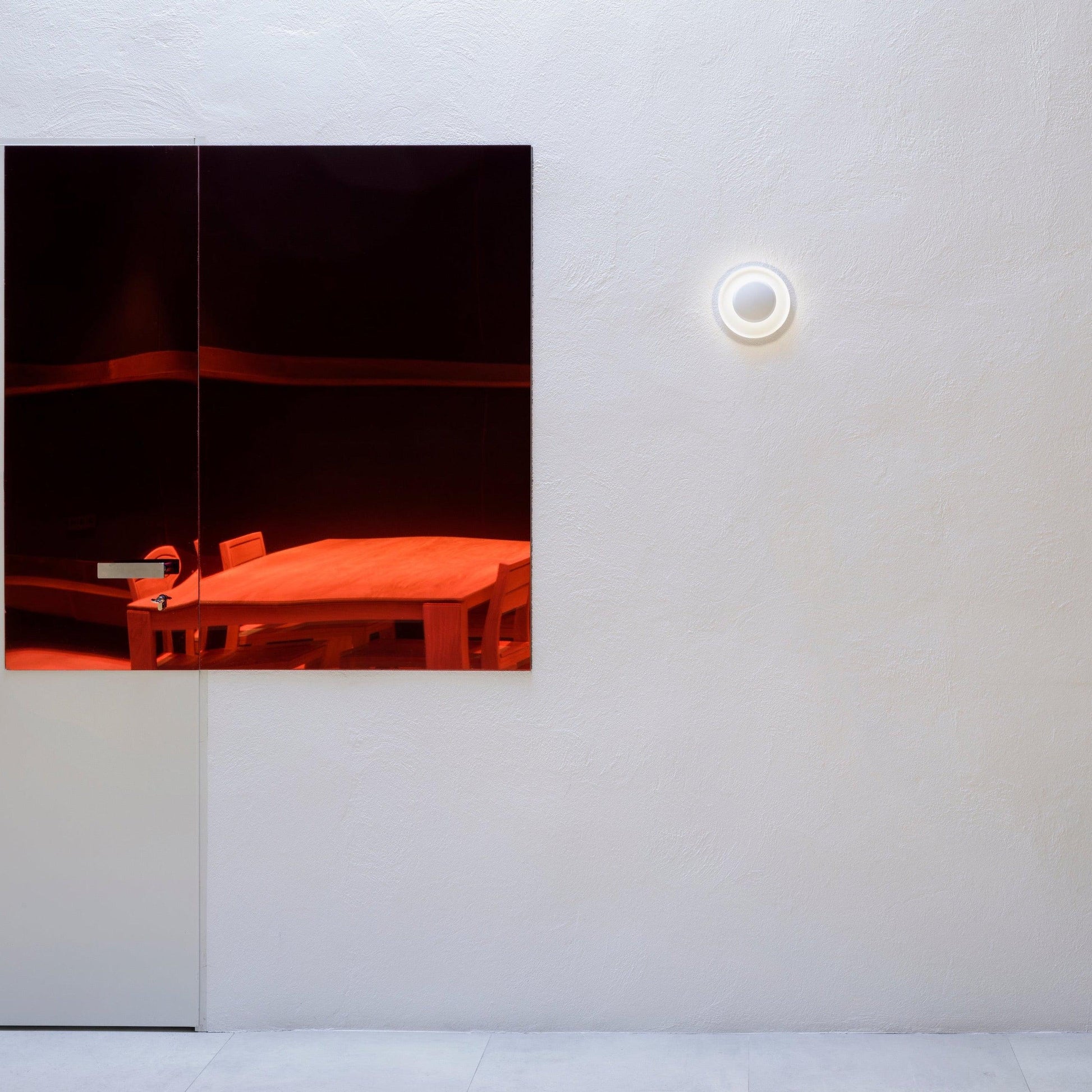 L'applique murale Top de Vibia, avec sa petite sphère centrale qui réfléchit la lumière vers un anneau périphérique plus large, crée un halo lumineux diffus et apaisant, instaurant une ambiance relaxante. La lumière semble encadrée par son propre diamètre ; son design minimaliste et élégant en fait une véritable œuvre d'art murale abstraite.